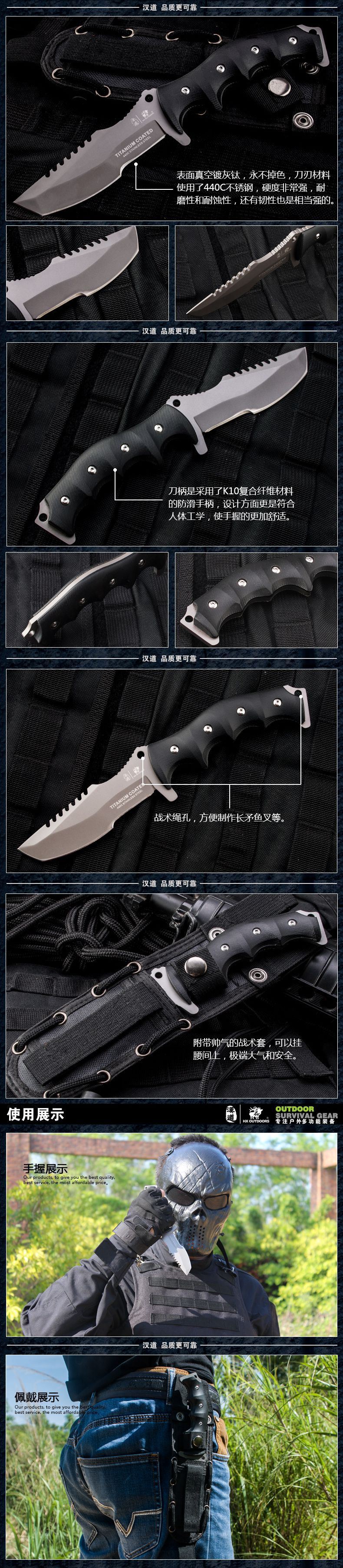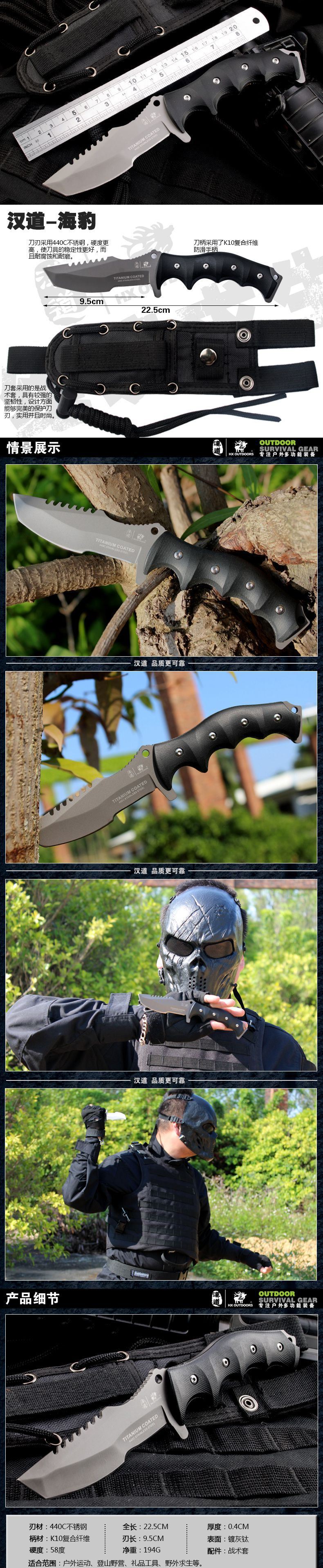 汉道海豹战术刀 全长:22.5CM 刃长:9.5CM 刃厚:0.4CM 表面:镀灰钛 刃材:440C不锈钢 硬度:58HRC 手柄:K10复合纤维防滑手柄 重量:200g 配件:战术套