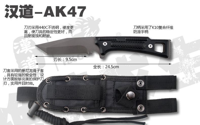 汉道AK47战术直刀(枪托) 刃材:440C不锈钢 全长:245MM 刃长:95MM 柄材:K10复合纤维 表面:镀灰钛 硬度:58HRC 净重:223G 配件:尼龙绳套