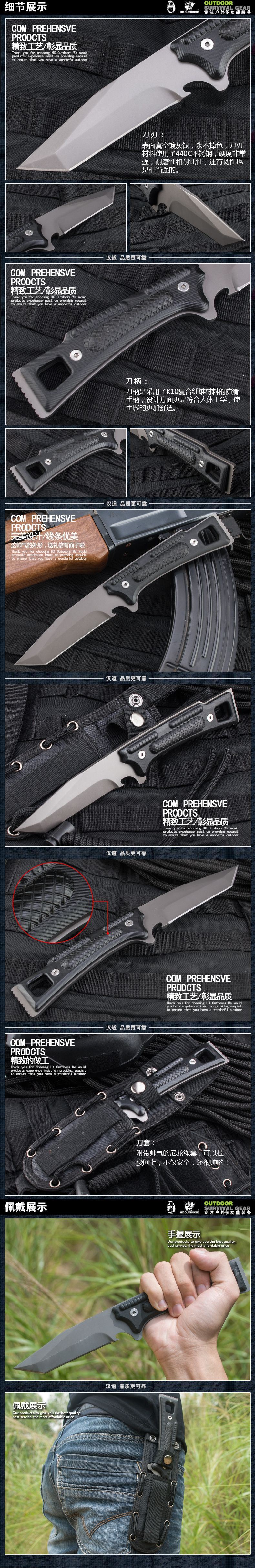刃材:440C不锈钢 全长:245MM 刃长:95MM 柄材:K10复合纤维 表面:镀灰钛 硬度:58HRC 净重:223G 配件:尼龙绳套