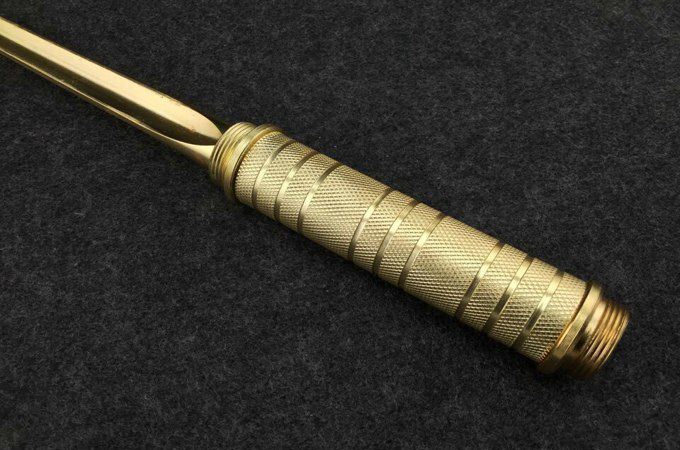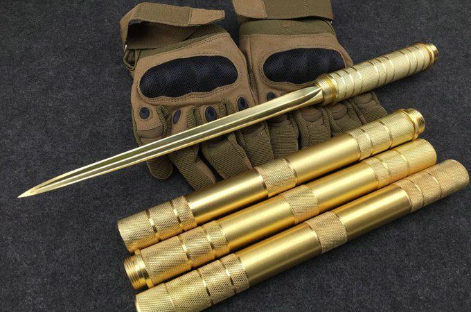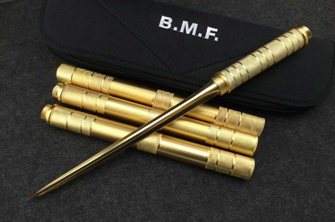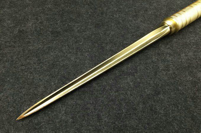 加长版三棱刺(黄金色) 完全可以反接上最长117.5cm 刃 长: 26.0CM 刃 材: 三棱刃不锈钢 柄 长: 13CM 重 量: 1345克 刀 鞘: 尼龙袋 其 它: 镀黄金色