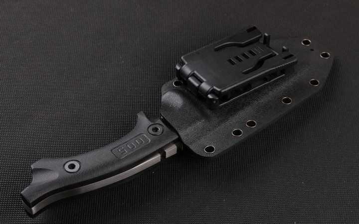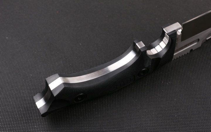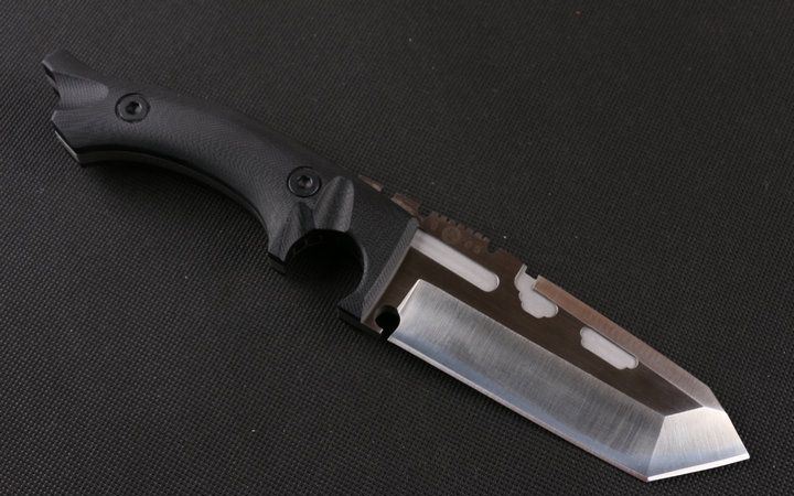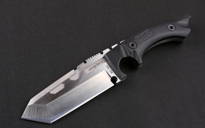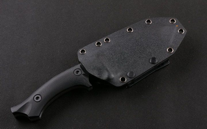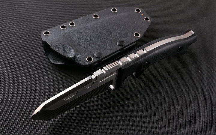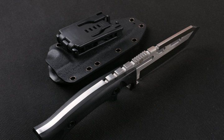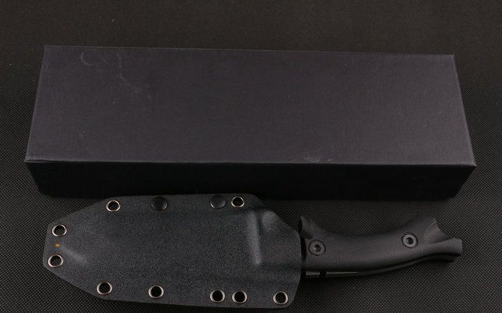Dwaine.carrllo硬汉直刀 全长:26cm 刃长:11cm 刃厚:0.65mm 刃宽:4.5cm 柄长:13.8cm 刃材:145CM 刀重:400克 总重:650克 表面:砂光伴拉丝 柄材:黑色G10 硬度:60C(真空处理) 刀鞘:战术K鞘(美国进口Kydex板材) 包装:黑色礼品盒