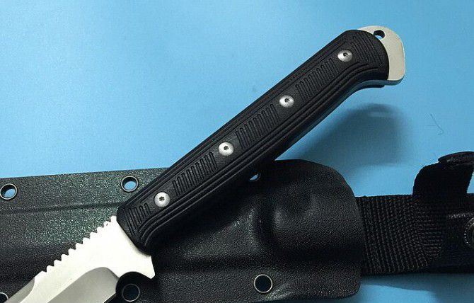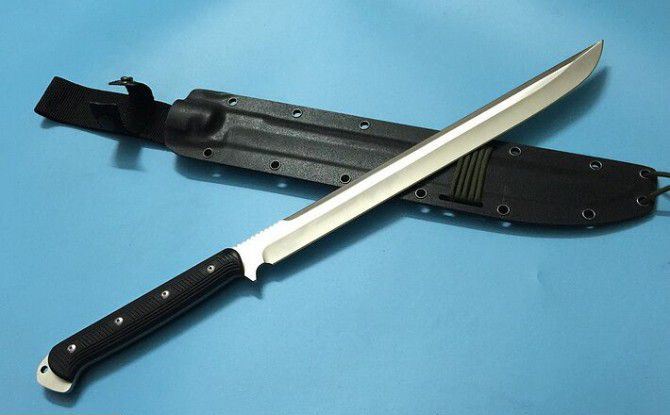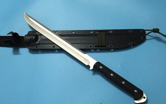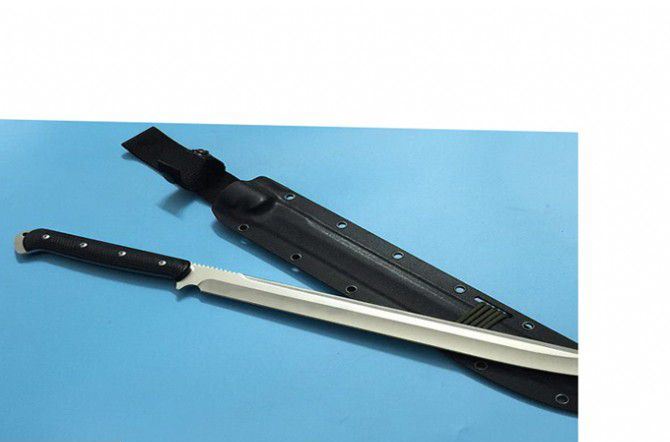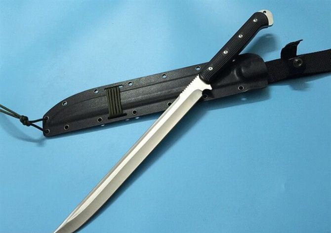 全长:47.8cM 刃长:32.5cm 厚度:0.7CM 刃宽:2.8CM 硬度:60HRC 刃材:9Cr18M0V 重量:508g含包装 柄材:G10手柄 刃面:沙光 配k鞘+纸盒
