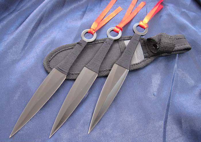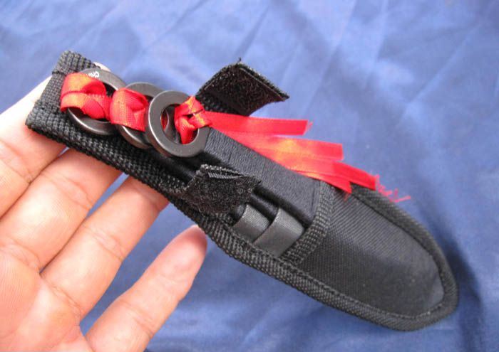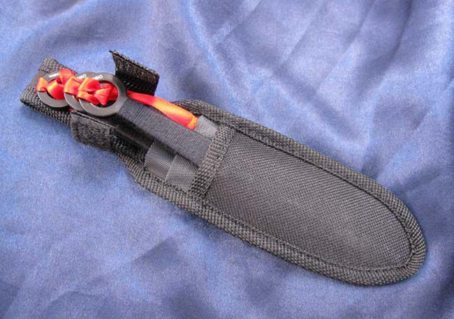 红绸飞镖三套装(黑版) 全长:15.7 CM 刃长:9 CM 刃宽:10 CM 厚度:0.32 钢材:420不锈钢 硬度HRC 55 整套重量:130克 配尼龙刀套(可别在腰带上) 每套包含3把大小一样的飞镖