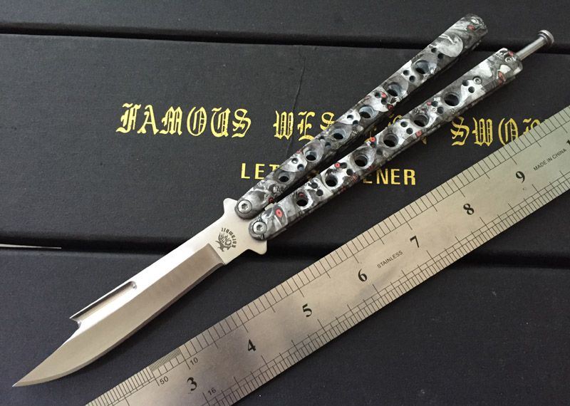 全长:23.8CM 刃长:9.5CM 刃厚:0.3CM 刃材料:440C 刃硬度:58 柄材料:不锈钢压铸 柄硬度:40 重量:180克 刀鞘:刺绣高级尼龙套,可横竖挂皮带 The One BM异形款之插槽刃,由The one (唯一)精工打造,是现成BM系列变异款式,刃型奇特,水滴形刃附加插槽副刃,非常凶悍!整刀用铆钉铆合,省去螺丝难维护的特点,一体柄型更坚固和耐摔,骷髅迷彩,转动灵活,由THE ONE 出品,不可多得的精品甩刀!