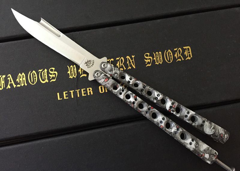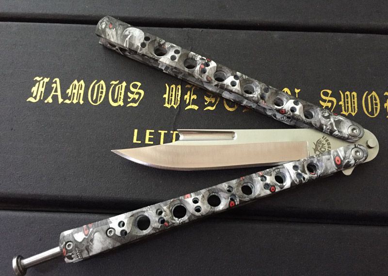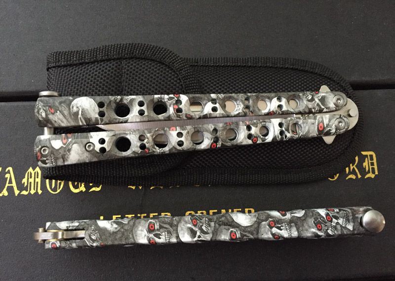 The One BM异形款—插槽刃(骷髅迷彩柄) 全长:23.8CM 刃长:9.5CM 刃厚:0.3CM 刃材料:440C 刃硬度:58 柄材料:不锈钢压铸 柄硬度:40 重量:180克 刀鞘:刺绣高级尼龙套,可横竖挂皮带 The One BM异形款之插槽刃,由The one (唯一)精工打造,是现成BM系列变异款式,刃型奇特,水滴形刃附加插槽副刃,非常凶悍!整刀用铆钉铆合,省去螺丝难维护的特点,一体柄型更坚固和耐摔,骷髅迷彩,转动灵活,由THE ONE 出品,不可多得的精品甩刀!