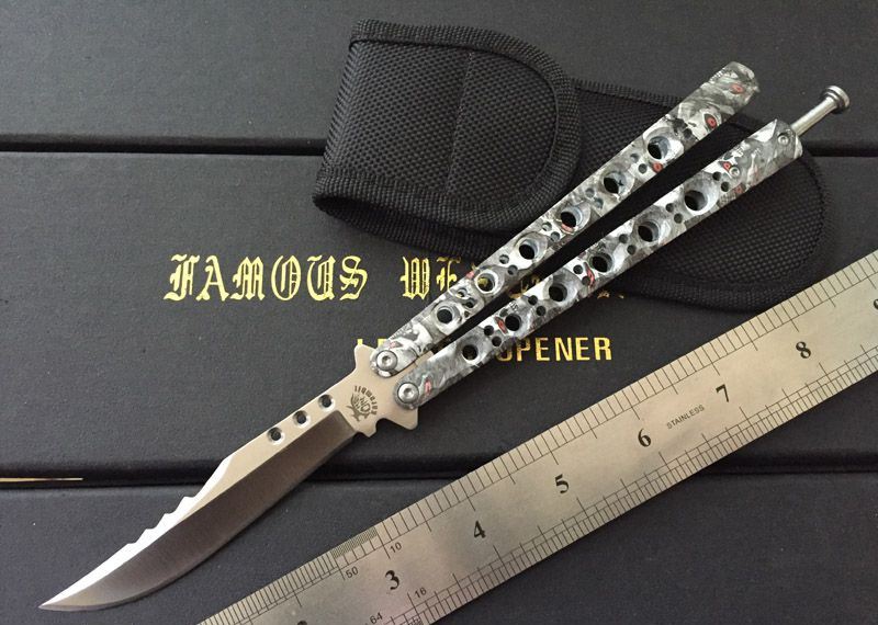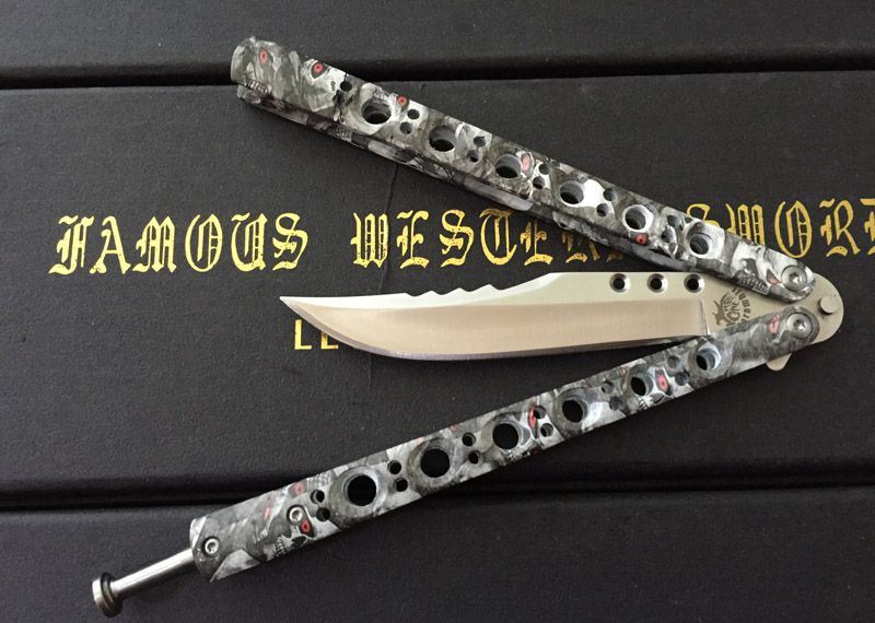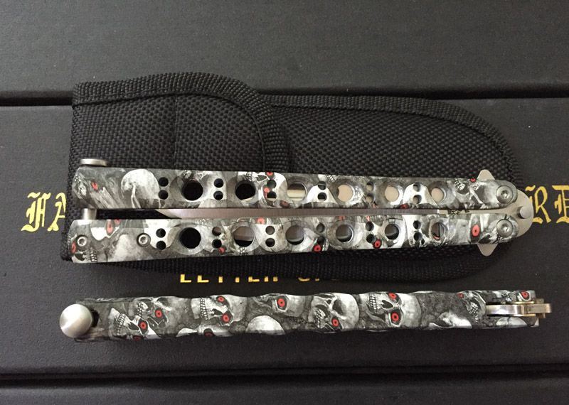The One暴龙刃甩刀(骷髅迷彩柄) 全长:23.8CM 刃长:9.5CM 刃厚:0.3CM 刃材料:440C 刃硬度:58 柄材料:不锈钢压铸 重量:180克 刀鞘:刺绣高级尼龙套,可横竖挂皮带 The One暴龙款BM43, 经典Benchmade(蝴蝶)甩刀BM系列,由The one (唯一)精工打造,博弈刃型,暴龙背齿,整刀用铆钉铆合,省去螺丝难维护的特点,一体柄型更坚固和耐摔,骷髅迷彩,转动灵活,由THE ONE 出品,不可多得的精品甩刀