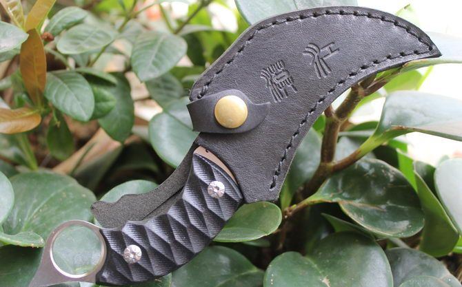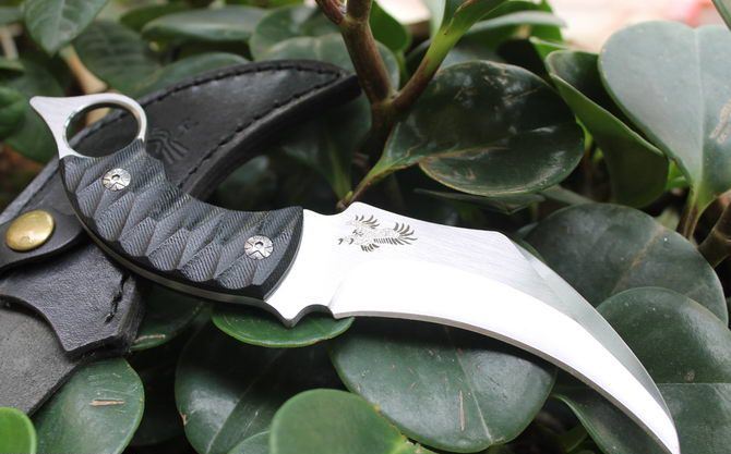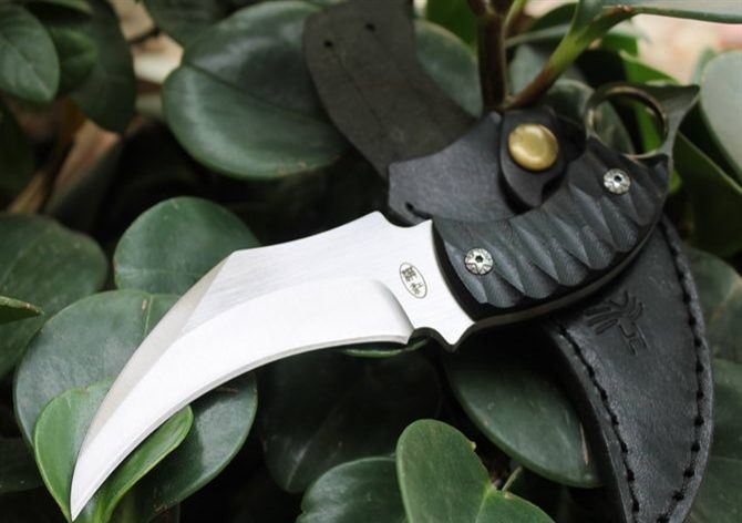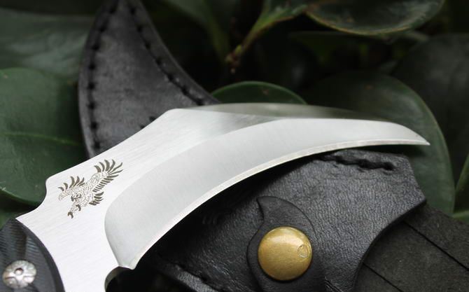 漠江魔爪刀 全 长: 21.5cm 刃 长: 10cm 刃 宽: 3cm (最宽处) 刃 材: 7Cr17 硬 度: 57HRC 表 面: 砂光 刃 厚: 0.5cm 柄 长: 10.2cm 柄 材: 米克塔 重 量:240克(含鞘)