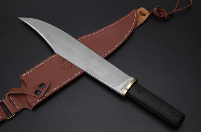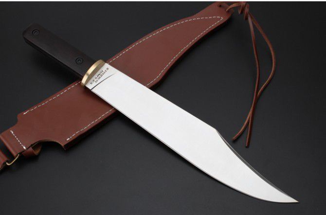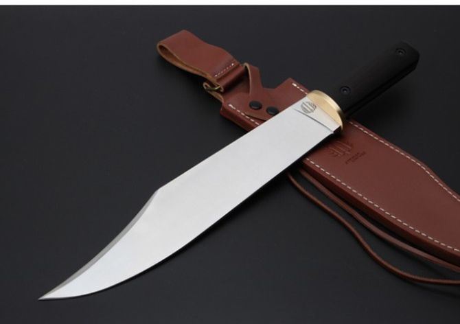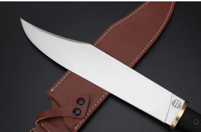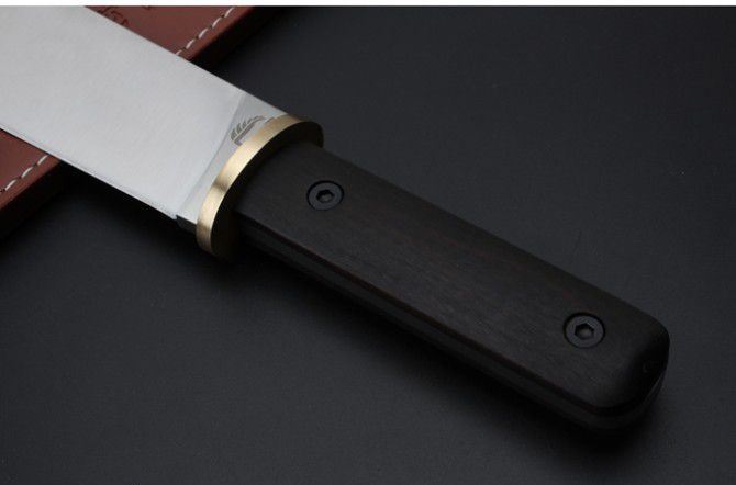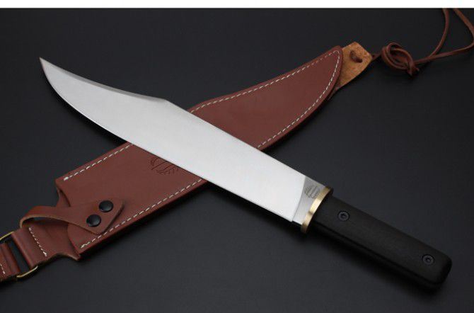 米克边缘人直刀 全 长:448mm 刃 长:320mm 柄 长:128mm 刃 宽:56mm 刃 厚:6mm 刃 材:5Cr15Mov 重 量:1037g(含包装) 硬 度:58HRC 以上 表 面:沙光 柄 材:钢一体柄+非洲黑檀+铜头 锁 型:定锁 其 他:配硬纸盒+牛皮套