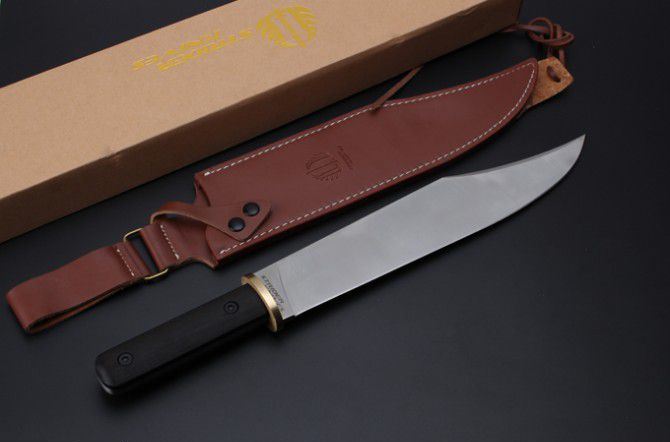 全 长:448mm 刃 长:320mm 柄 长:128mm 刃 宽:56mm 刃 厚:6mm 刃 材:5Cr15Mov 重 量:1037g(含包装) 硬 度:58HRC 以上 表 面:沙光 柄 材:钢一体柄+非洲黑檀+铜头 锁 型:定锁 其 他:配硬纸盒+牛皮套