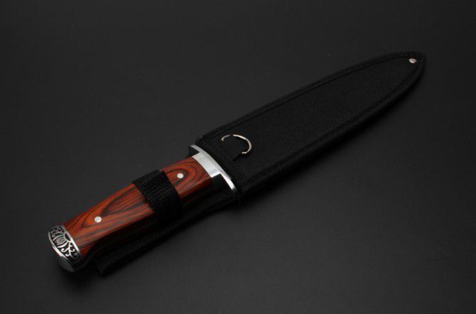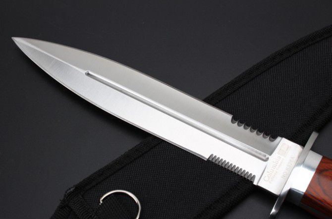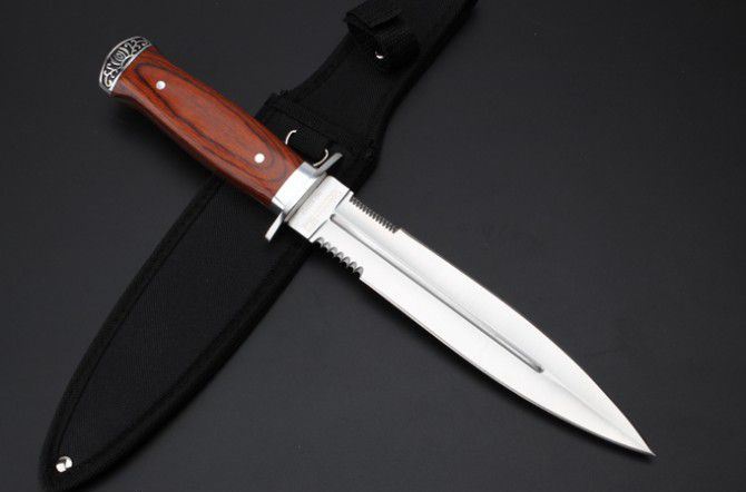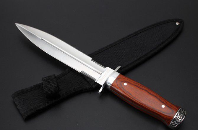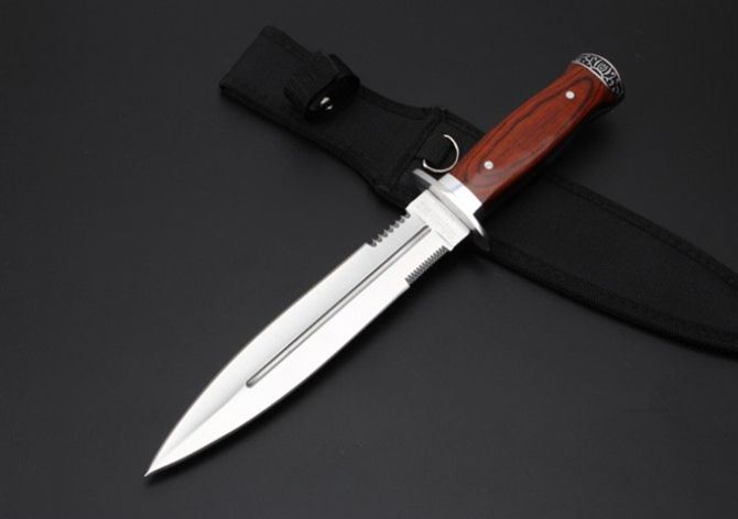 K326A双刃刺刀 全 长:325mm 刃 长:20.2mm 柄 长:123mm 刃 宽:32m 刃 厚:3.2mm 刃 材:3Cr13Wov 重 量:341g(含包装) 硬 度:55HRC 表 面:砂光 柄 材: 红 彩木+双钢头 锁 型:定锁 其 他:配尼龙套