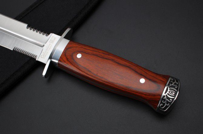 全 长:325mm 刃 长:20.2mm 柄 长:123mm 刃 宽:32m 刃 厚:3.2mm 刃 材:3Cr13Wov 重 量:341g(含包装) 硬 度:55HRC 表 面:砂光 柄 材: 红 彩木+双钢头 锁 型:定锁 其 他:配尼龙套