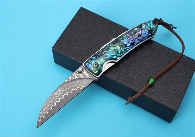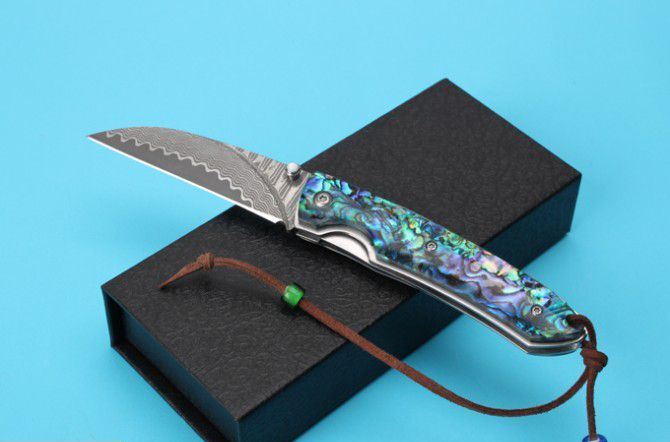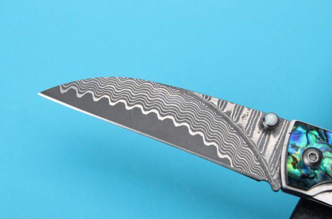 蓝鸟大马士革折刀 全长:18.5cm 刃长:8cm 厚度:2.8mm 柄长:10.5cm 刃材:大马士革钢 柄材:蓝鲍贝+钢片 重量:135g(含包装) 锁型:则锁 包装:手工黑礼盒 着上千年历史的大马士革刀,完全由匠人手工打造,凝聚着匠人的灵性,精美而独特。它那与生俱来的魔性花纹彰显着高贵的灵魂,在古代,只有贵族才能拥有,更因其动人的传说和自身的优异性能,成为世界上最昂贵、最坚韧、最著名,同时也是刀具收藏界的极品之刃。