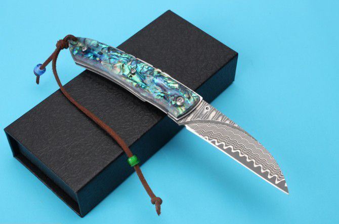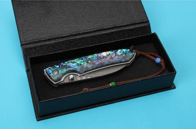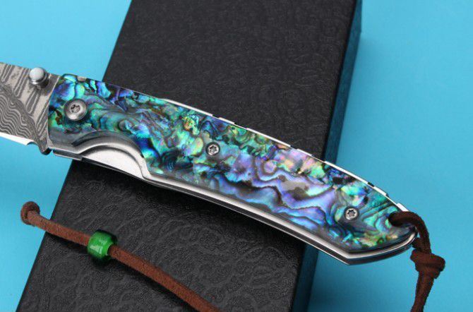 全长:18.5cm 刃长:8cm 厚度:2.8mm 柄长:10.5cm 刃材:大马士革钢 柄材:蓝鲍贝+钢片 重量:135g(含包装) 锁型:则锁 包装:手工黑礼盒 着上千年历史的大马士革刀,完全由匠人手工打造,凝聚着匠人的灵性,精美而独特。它那与生俱来的魔性花纹彰显着高贵的灵魂,在古代,只有贵族才能拥有,更因其动人的传说和自身的优异性能,成为世界上最昂贵、最坚韧、最著名,同时也是刀具收藏界的极品之刃。