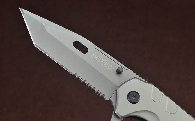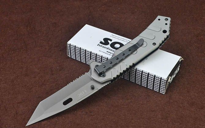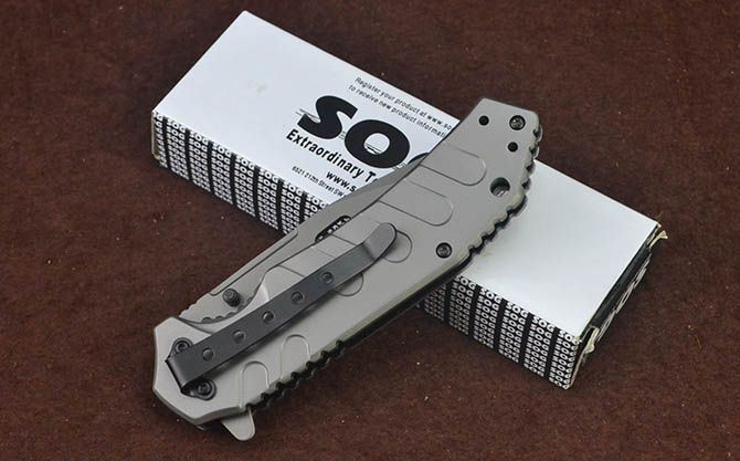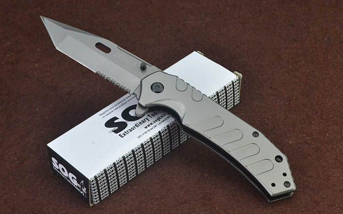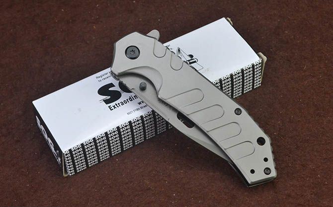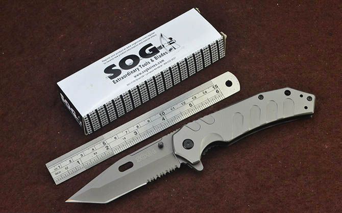 SOG.K959B助力折刀(镀钛) 全长:21.1cm 刃长:9cm 柄长:12.2cm 刃厚:0.29cm 刃宽: 2.7cm 刃材: 440C 柄材: 扎纹全钢 硬度: 56HRC 净重:200克 锁定:线锁 表面处:全钛 其他:原厂彩合