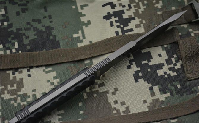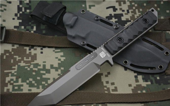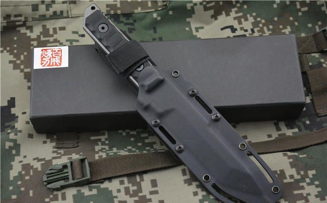 新款百炼无敌金刚(黑钛色) 全长:289MM 刃长:134MM 刃宽:33MM 刃厚:8.0MM 刃面处理:镀枪钛,钢本拉丝 热处理:真空油淬热处理 硬度: 58HRC 材料:918钢材 柄材:黑色G10 刀鞘:进口K鞘 包装:黑色礼品盒
