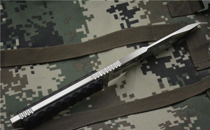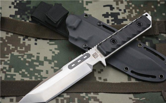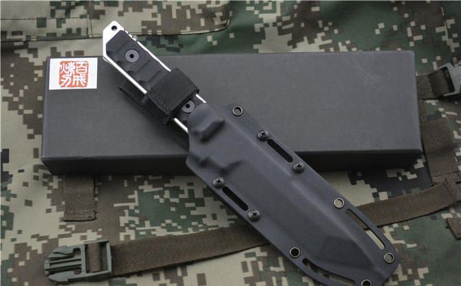 新款百炼无敌金刚(白版)钢本拉丝 全长:289MM 刃长:134MM 刃宽:33MM 刃厚:8.0MM 刃面处理:钢本拉丝 热处理:真空油淬热处理 硬度: 58HRC 材料:918钢材 柄材:黑色G10 刀鞘:进口K鞘 包装:黑色礼品盒