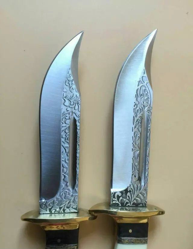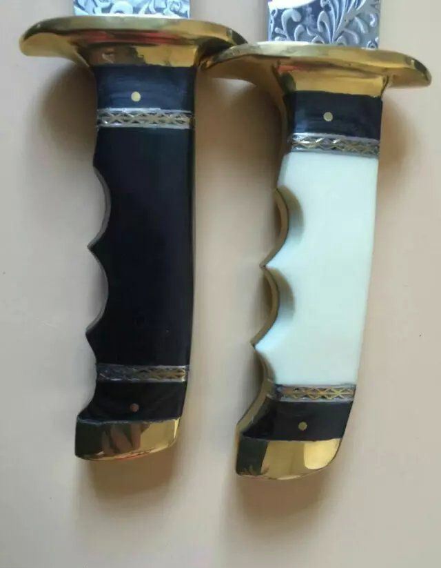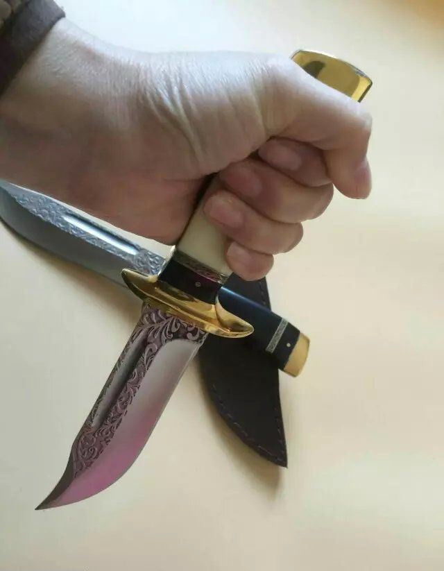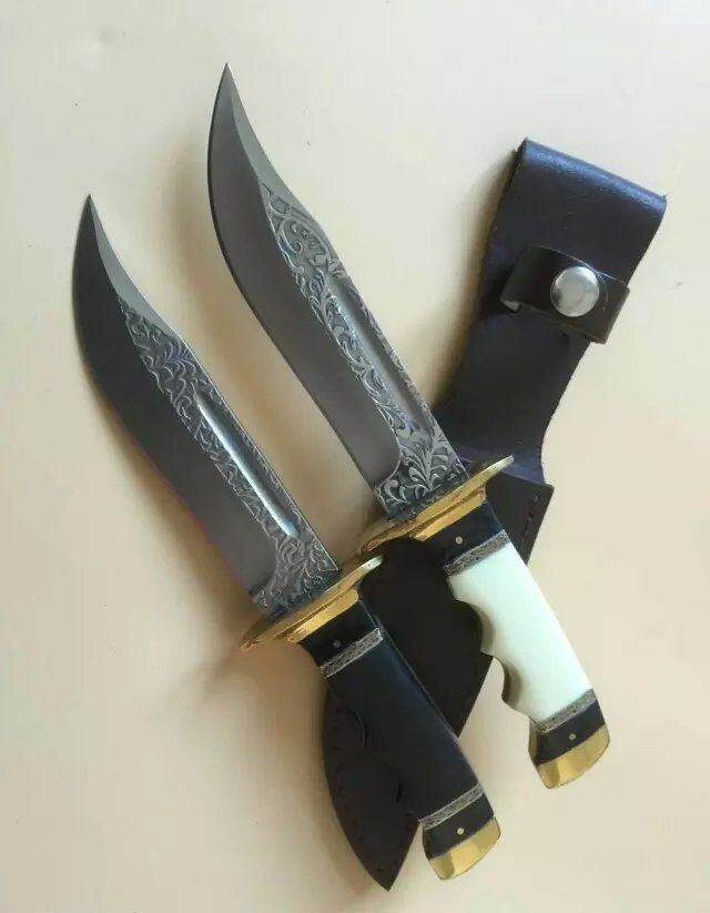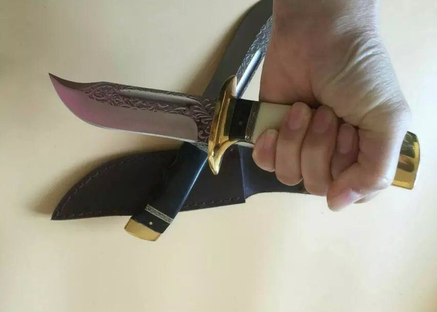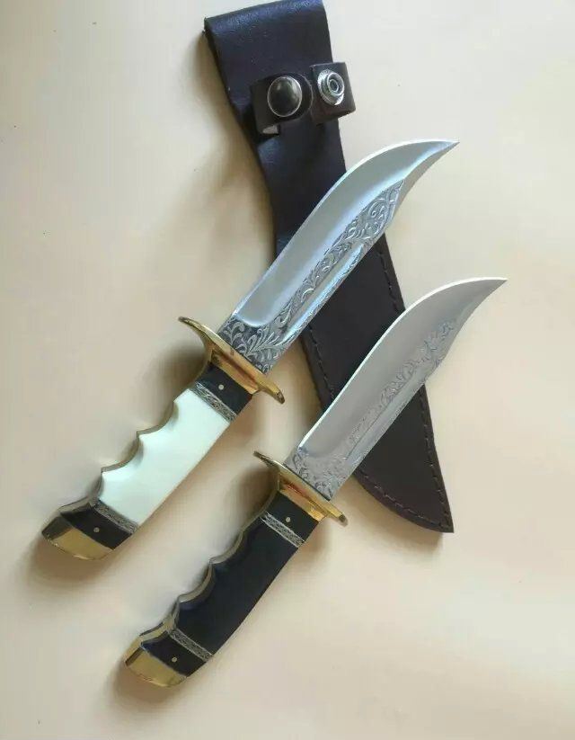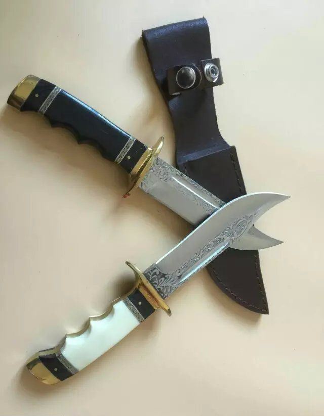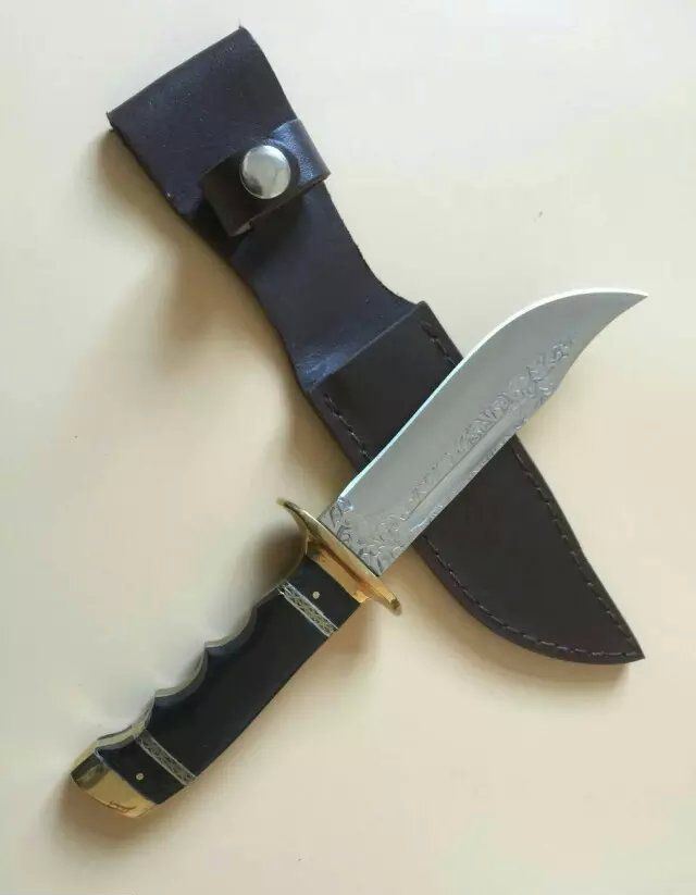 成吉思汗小猎刀(黑檀木、兽骨柄) 全 长:255mm 刃 长:145mm 柄 长:11mm 刃 宽:32mm 刃 厚:5.0mm 刃 材:5Cr13Mov 重 量:335g(含包装) 硬 度:57HRC 表 面:腐蚀纹+白钢 柄 材:双铜头+兽骨 其 他:配牛皮套