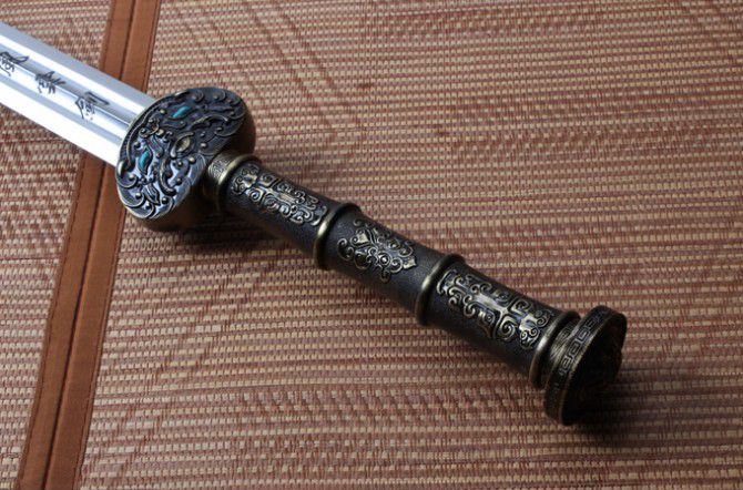 24寸花纹钢风云剑(檀木) 【规格】 全长:96.2cm左右,刃长:63cm,柄长:27.0cm,刃宽:4.2cm,刃厚:0.9cm 重量3322g含包装 【刃材】 花纹钢手工打造 【工艺】 花纹钢手工打造 古法热处理 手工精细磨 【鞘材】 名贵檀木 【装具】 金装 【硬度】 57 HRC 【柄材】 名贵檀木 【赠品】 锦盒 【其他】 手工产品,稍有差别,请以实物为准