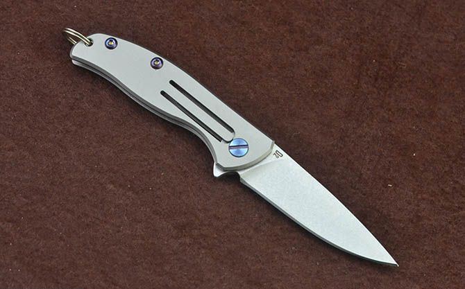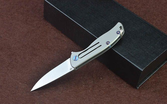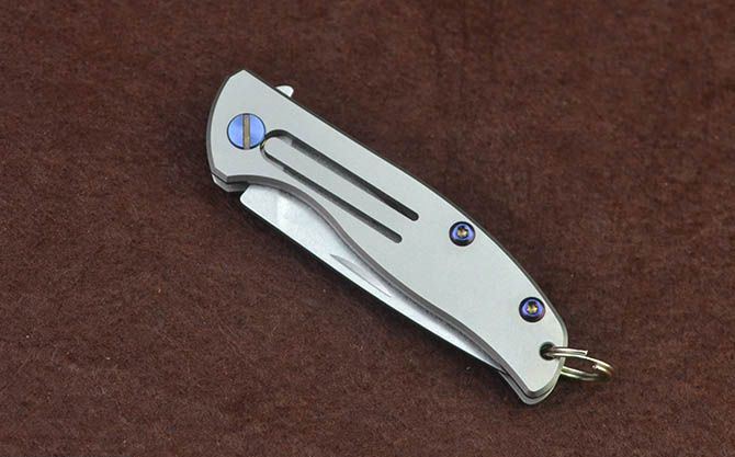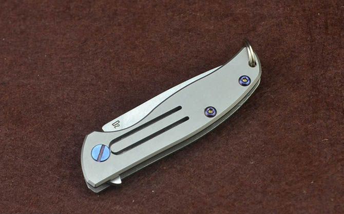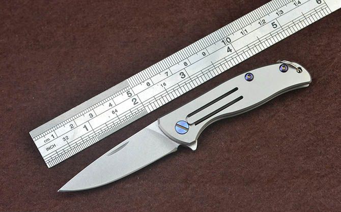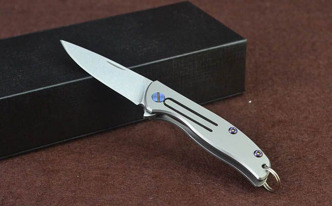 迷你钛柄小匙扣刀 总 长: 122mm 刃 长: 52mm 柄 长: 70mm 刃 厚: 2.4mm 刃 材: D2真空处理 刃 面处理:石洗 柄 材: 钛合金 硬 度:58-59 锁 定: 无锁 重 量: 100克(含包装) 包 装: 原厂礼品盒