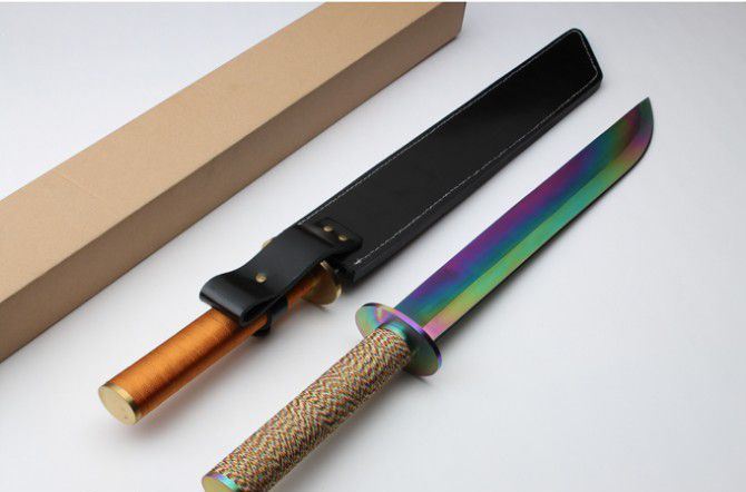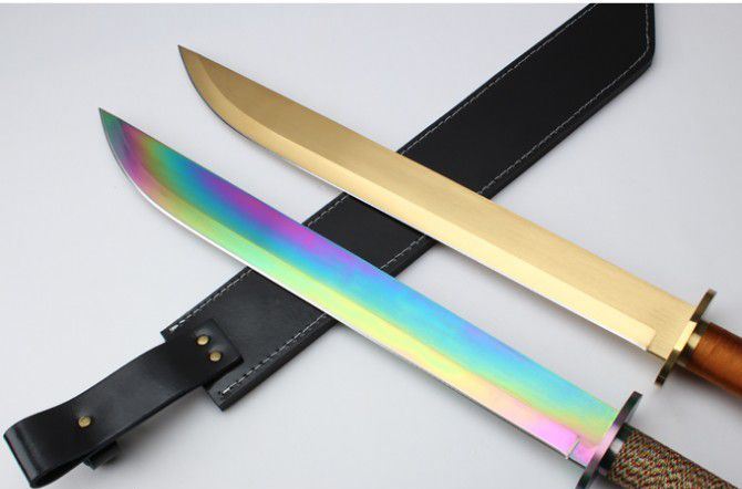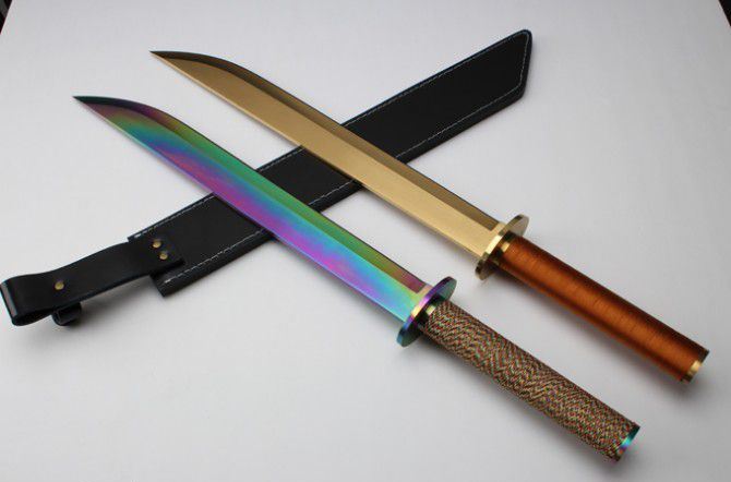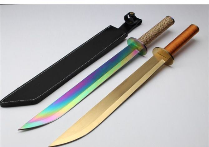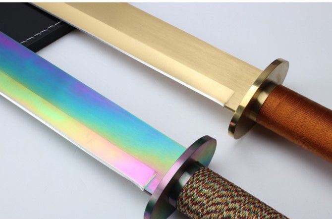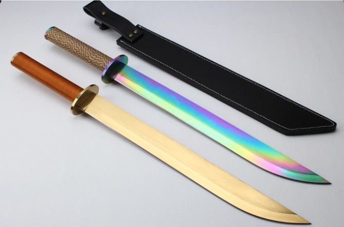 明朝锦衣卫佩刀尖头(彩钛、黄金) 全 长:705mm 刃 长:475mm 柄 长:198mm 刃 宽:50mm 刃 厚:6.5mm 刃 材:5Cr13Mov 重 量:1700g(含包装) 硬 度:57HRC 表 面:镀金色 柄 材:黑檀木+编织防滑绳 锁 型:定锁 其 他:配皮套