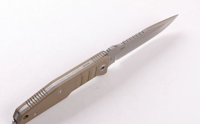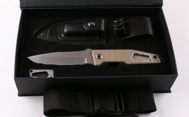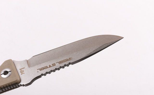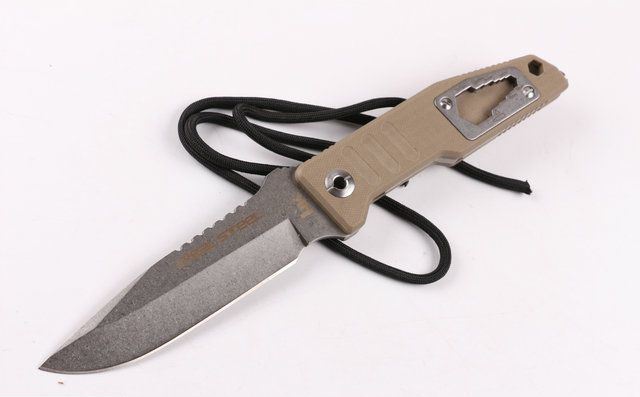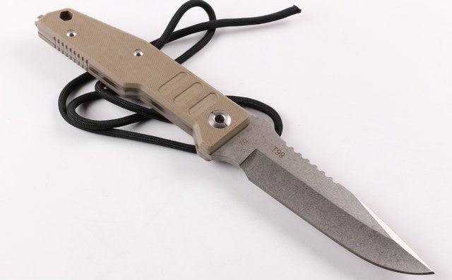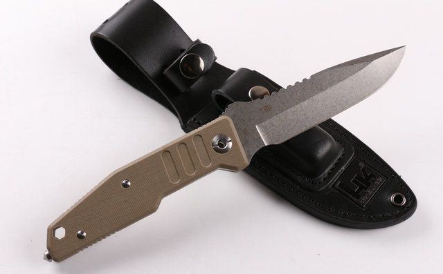 德国H&K杜宾直刀 全长:21CM 刃长:9.8CM 刃宽:2.9CM 刃厚:4MM 柄长:12.5CM 表面:石洗 刃材:高速D2钢 硬度:59-60(保证实标) 柄材:强化G10 重量:644克(含原装盒子 鞘) 刀鞘:真皮套 其他:配一个多用六角器