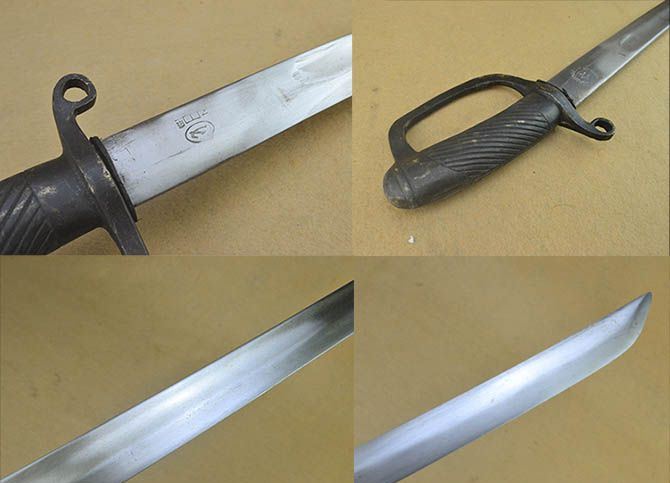 苏联骑兵刀带四棱刺老刀 刀长:91.5厘米 刃宽:3.2厘米 刃长:77.5厘米 刃厚:0.74厘米 柄长:14厘米 材质:不明确 硬度:不明确 柄材:黄铜 刀鞘:黄铜 全重:2000克(含四菱刺) 四菱刺尺寸: 刀全长:52.5cm 刃 长:43cm 刀柄长:7cm 刃 宽:1.5cm 重 量:360克 材 质:不明确 硬 度:不明确 新旧程度:7成新 注:刀刃与四菱刺刃为半开刃 苏联骑兵刀,大概上世纪20年代生产,高加索式样.外鞘带1891年式莫辛纳干步枪配用的四棱式刺刀一只