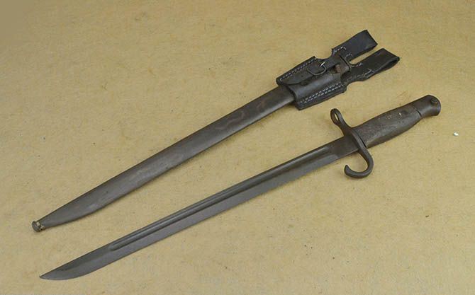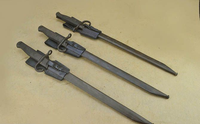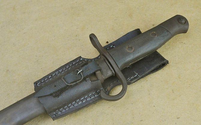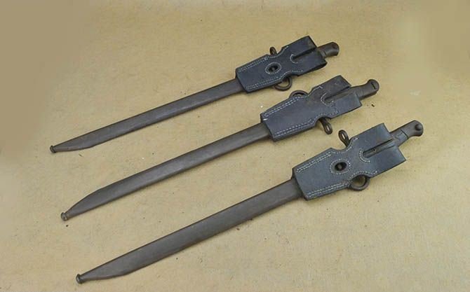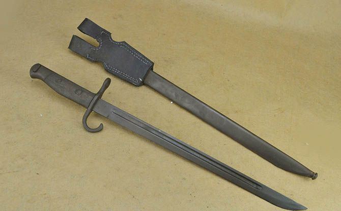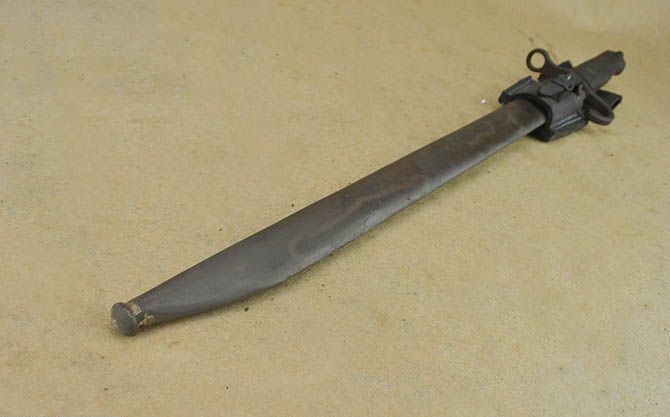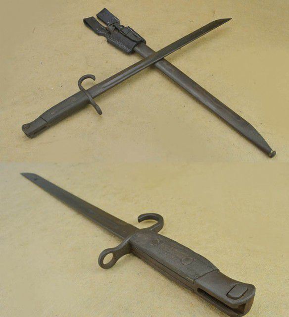 三八老枪刺老刀 刀长:49.5厘米 刃宽:2.5厘米 刃长:36.5厘米 刃厚:0.63厘米 柄长:12厘米 柄材:黄铜 刀鞘:铁+牛皮 全重:780克 新旧程度:7成新 注:刀刃为半开刃