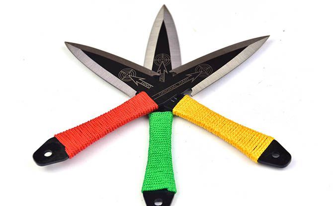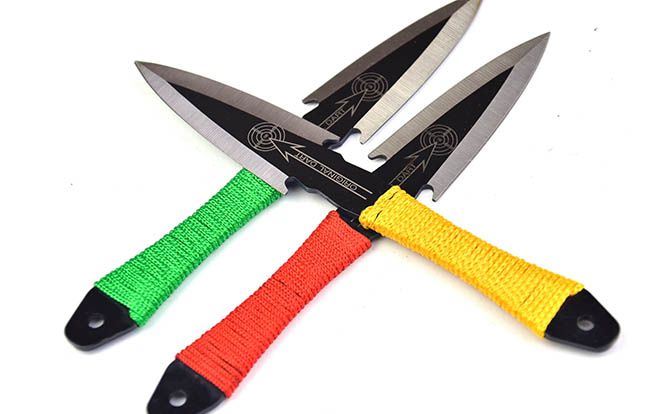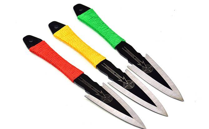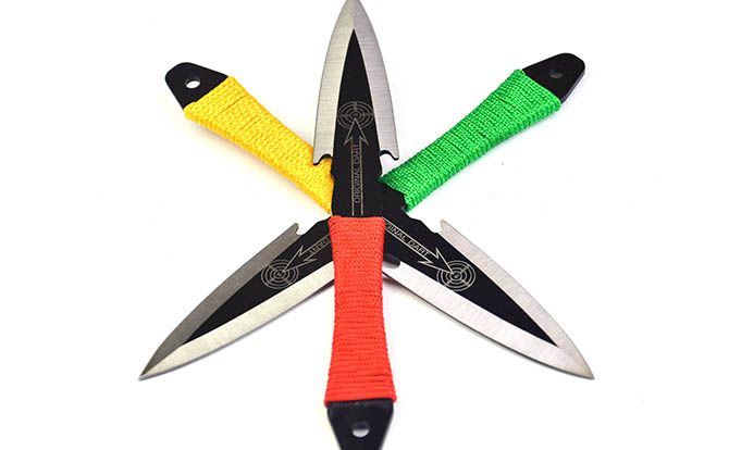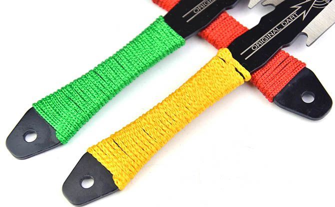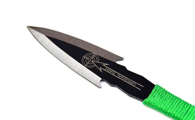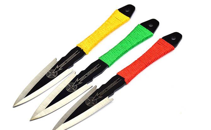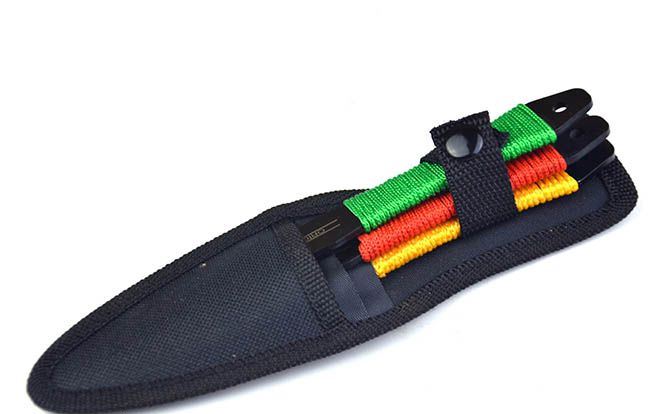 三色原始飞镖 长度:19.2cm 刃宽:2.8cm(最宽处) 刃厚:0.26cm 钢材:3Cr13Mov 柄长:8.5cm 总重:180g(含包装) 表面:喷黑色 刀套:尼龙套 其它:三支装