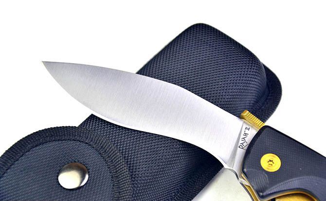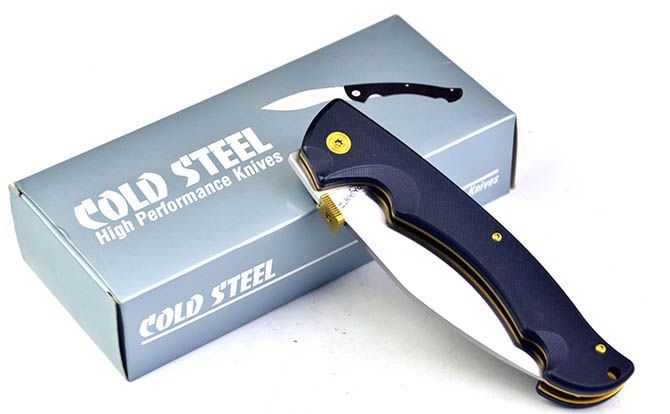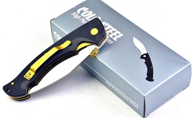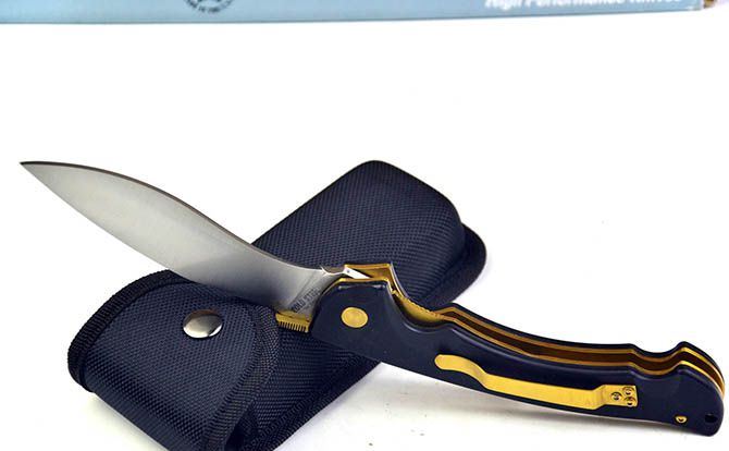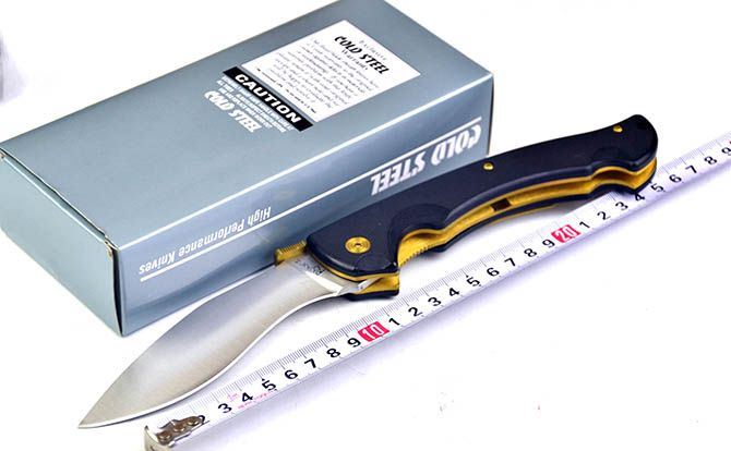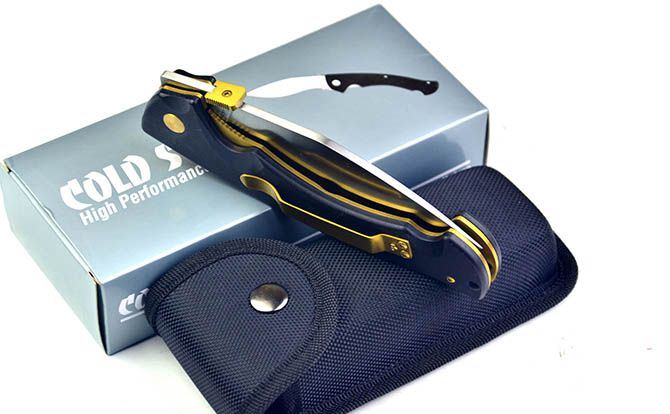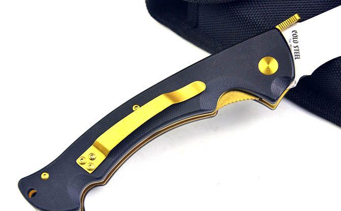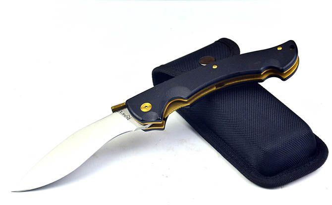 土豪金冷钢折叠大狗腿G10柄 全长: 27.5cm 刃长: 11.5cm 刃宽:3.5cm 厚度: 3.8mm 柄材: G10 锁型: 线锁 颜色: 砂光 材料:D2钢 硬度: 58-59 重量:350克 包装:原包装彩盒