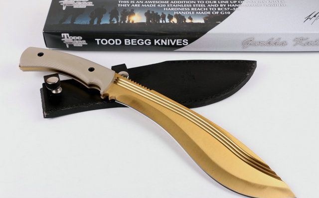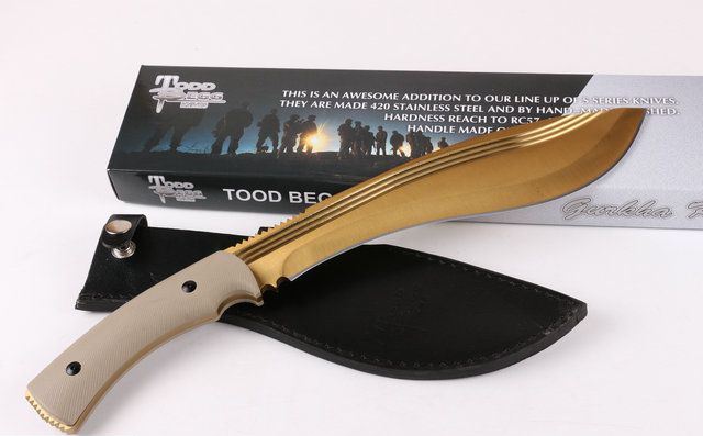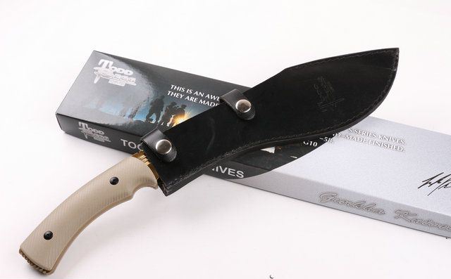 土豪金托德贝格手签版战刀 全 长:390mm 刃 长:257mm 柄 长:130mm 刃 宽:60mm 刃 厚:5.8mm 刃 材:7Cr17Mov 硬 度:58HRC 表 面:镀金色 柄 材:钢-体柄+G10 锁 型:定锁 其 他:配皮套+彩色纸盒