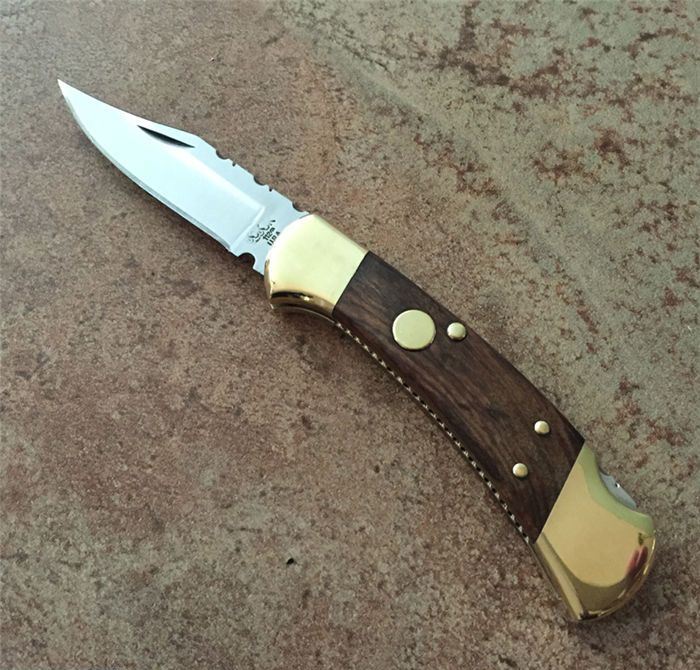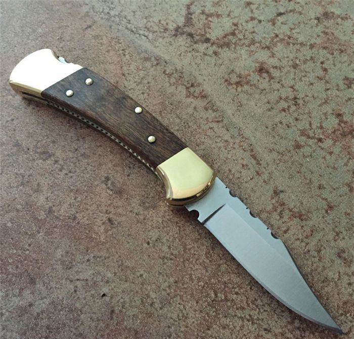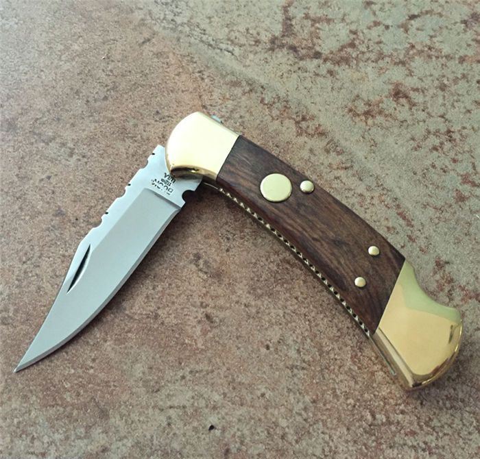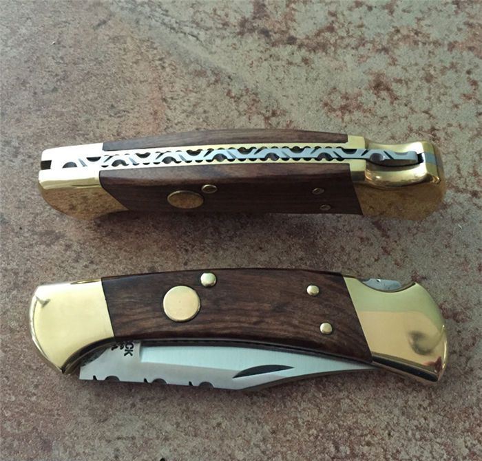 全长:17.5(CM) 刃长:8CM 刃材料:440C 刃厚:0.2宽刃口特锋利 硬度:59-60(实测硬度) 手柄:一体黄铜+香檀实木 刀重:160克 含包装重量:240克 包装:皮套+原装纸盒 UCK112自动款自2002年推出,提供便利的两种开刀模式,一种按下刀柄的按钮刀刃自动打开, 也可以按照传统开刀方式直接拉出刀刃,BUCK 公司延续BUCK112的传奇