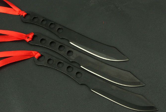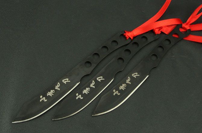 钢材:3Cr13Mov 长度:17cm 刃宽:2cm 刃厚:2.5cm(最宽处) 柄长:7.5cm 总重:140g(含包装) 表面:喷黑色 刀套:尼龙套 其它:三支装