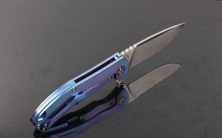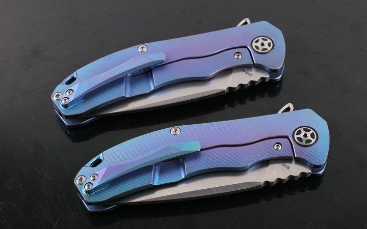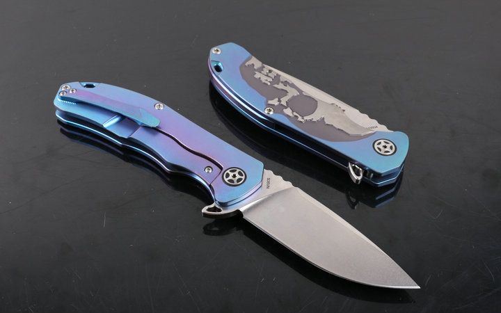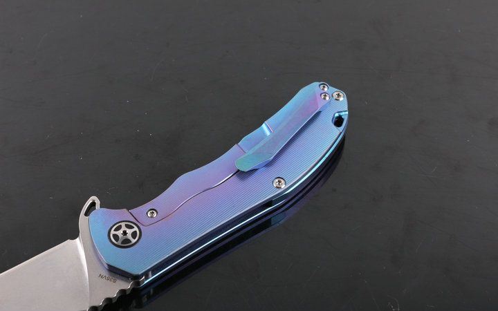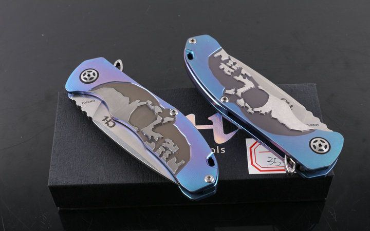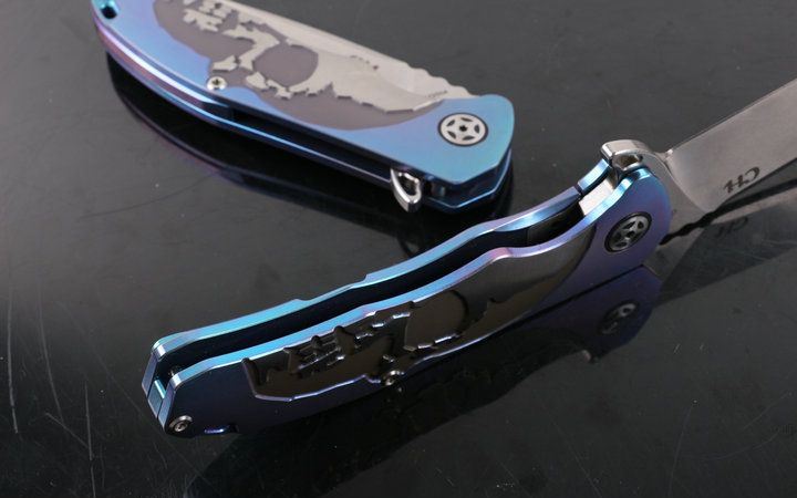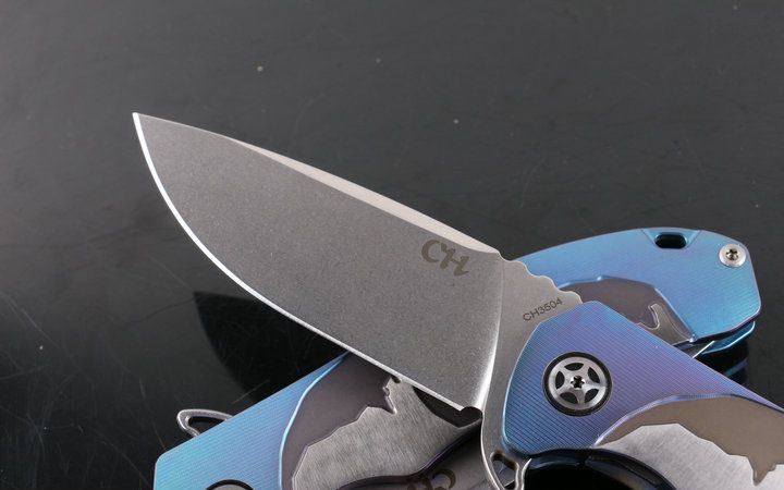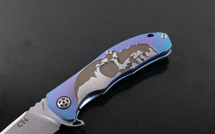 CH3504高端全钛柄战术球轴承翻转折刀(全手工版) 全长:21.0cm 柄长:12.0cm 刃长:9.0cm 刃厚:4mm 刃材:S35VN 硬度:59-60HRC 刀刃表面:石洗(非常细腻) 柄材:TC4钛合金柄面CNC精工刻画绘图 表面:阳极氧化 系统:滚珠轴承 刀重:153克 重量: 225克(含包装物) 热处理:真空热处理 包装:原厂礼品盒