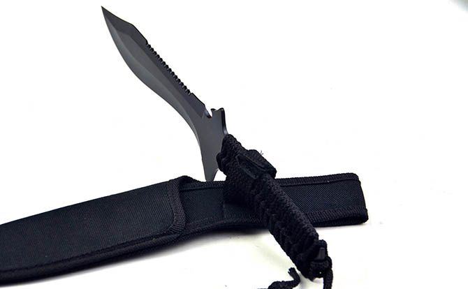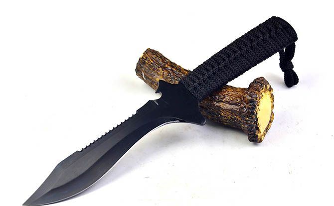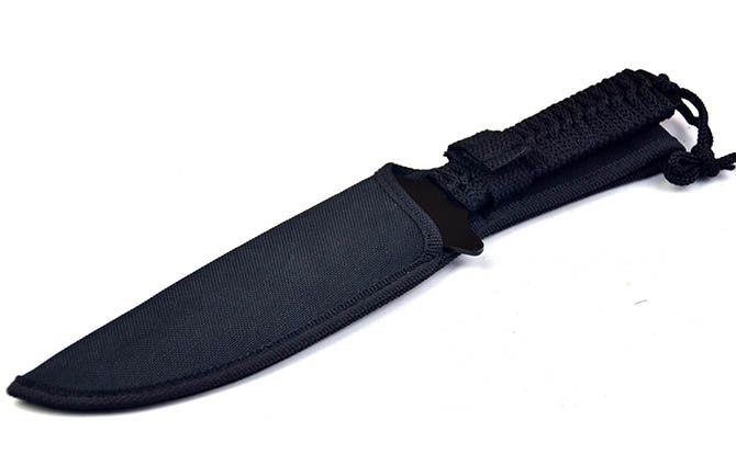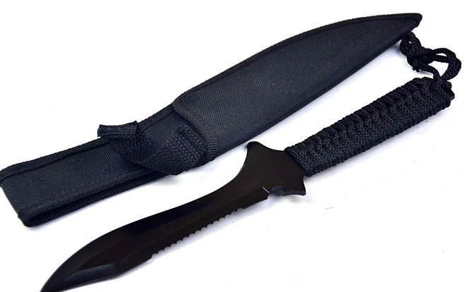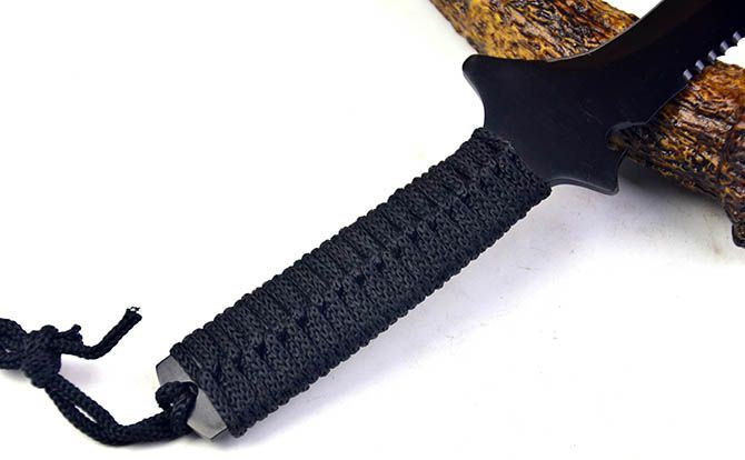 全长:28cm 刃长:14.5cm 柄长:11cm 刃厚:0.3cm 刃宽:3.5cm (最宽处) 表面;发黑 刃材:3Cr13 硬度: 56HRC 柄材;绑绳子 重量:170克(含包装) 包装:尼龙套