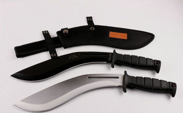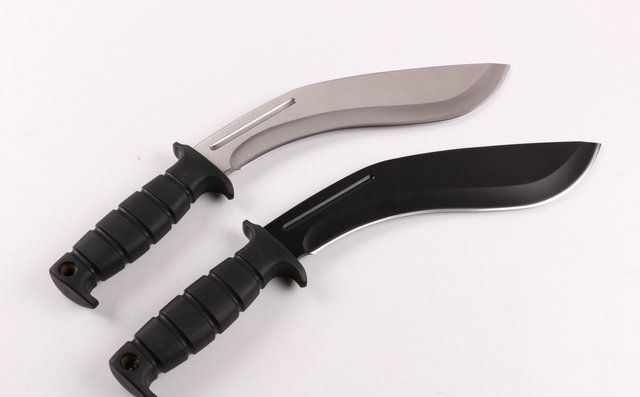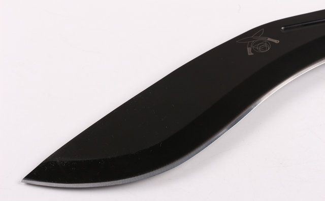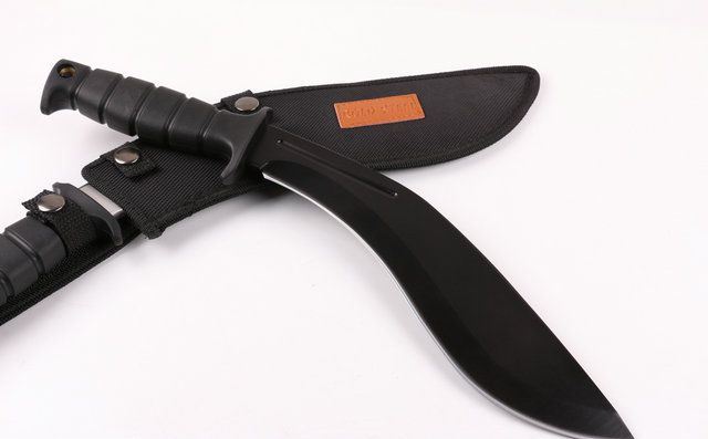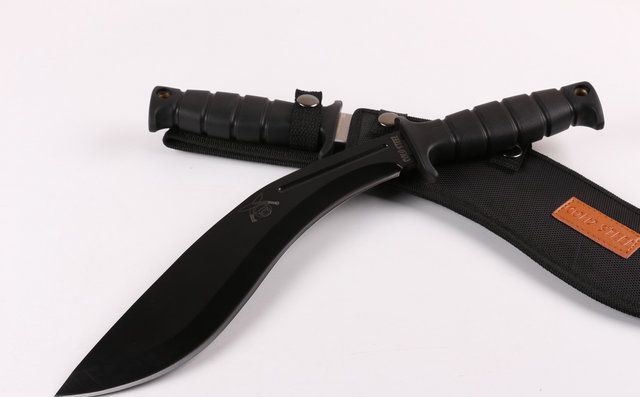 冷钢狗腿4号(黑白雄师) 全长:39.5cm 刃长:26.5cm 柄长:13cm 刃厚:0.6cm 刃宽:5.5cm (最宽处) 表面;砂光/发黑 刃材:5Cr17 硬度: 58HRC 柄材;ABS 重量:600克(含包装) 包装:彩盒+尼龙套