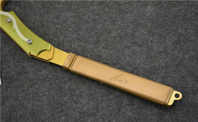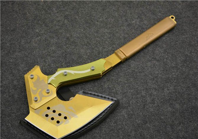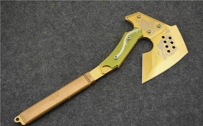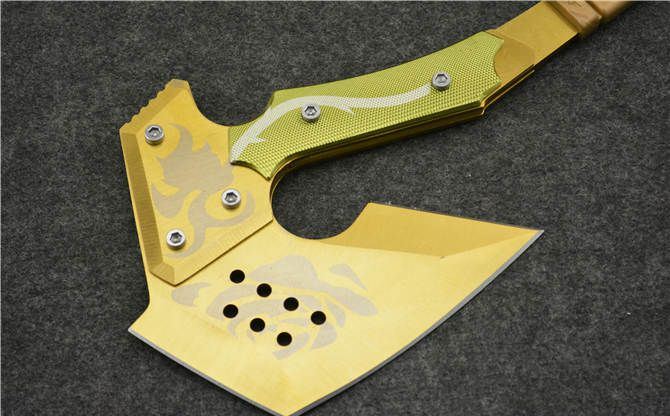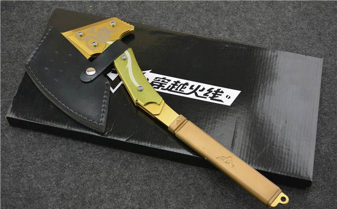 土豪金加强版穿越火线斧 全长:39cm 刃宽:16cm 刃厚:3cm 刃材:3CR13 硬度:54HRC 表面:镀钛金 柄材:ABS 柄长:17CM 净重:920克 毛重:1120克 刀鞘:仿皮套