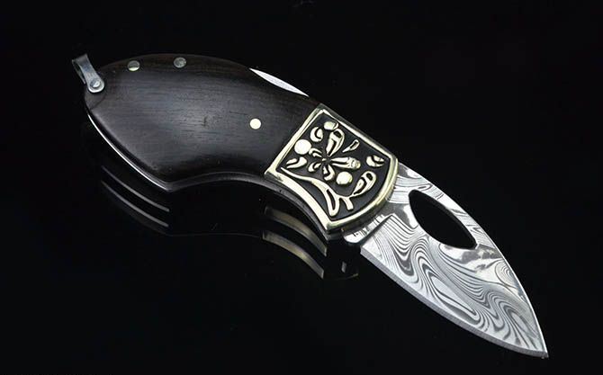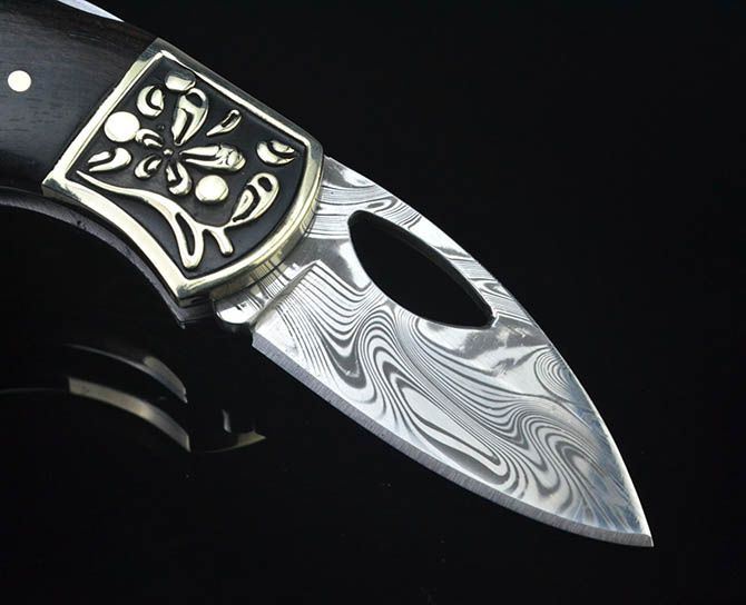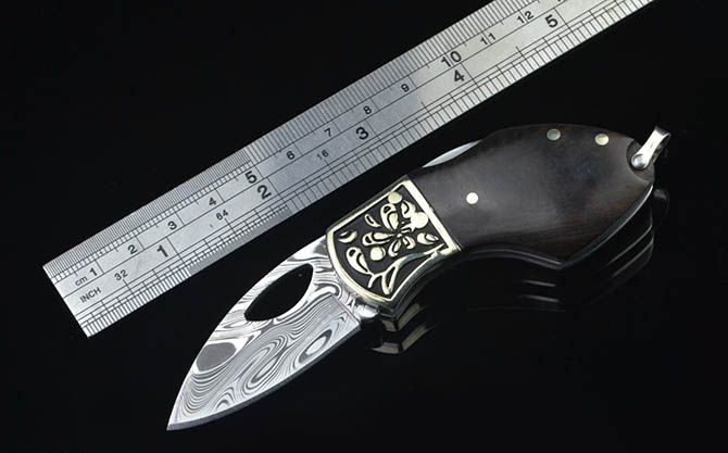 全 长:11.5cm 刃 长:4.5cm 刃 宽:2.2cm(最宽处) 柄 长:7cm 刃 厚:2.9mm 刃 材:大马士革瑞典粉末钢 柄 材:铜头雕花+黑檀木柄片 硬 度:59HRC 表 面:大马士革瑞典粉末钢花纹 重 量:103克(含包装) 锁 闭: 背锁 包 装:高档纸盒