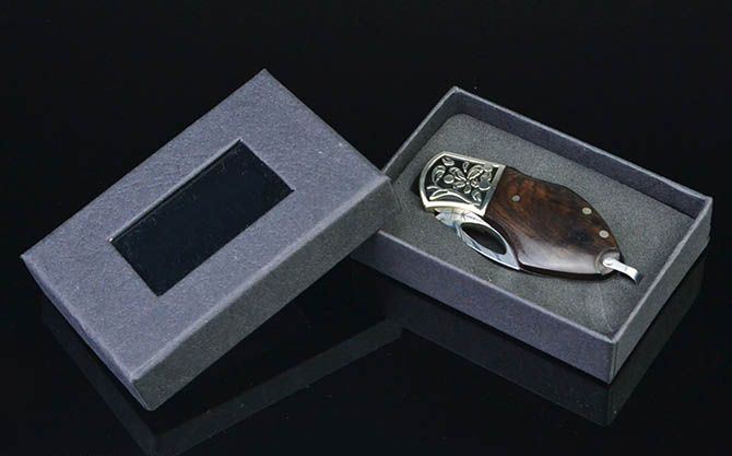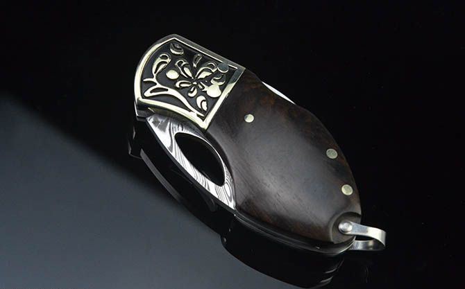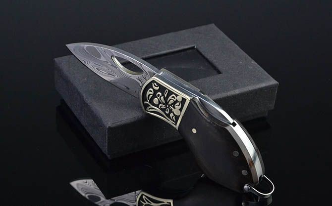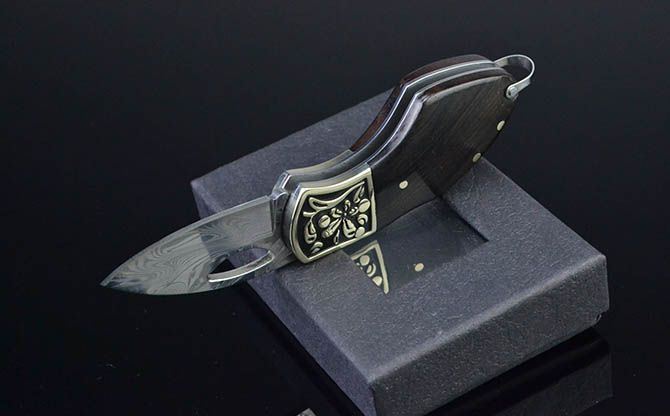 顶级瑞粉大马士革K1匙扣刀 全 长:11.5cm 刃 长:4.5cm 刃 宽:2.2cm(最宽处) 柄 长:7cm 刃 厚:2.9mm 刃 材:大马士革瑞典粉末钢 柄 材:铜头雕花+黑檀木柄片 硬 度:59HRC 表 面:大马士革瑞典粉末钢花纹 重 量:103克(含包装) 锁 闭: 背锁 包 装:高档纸盒