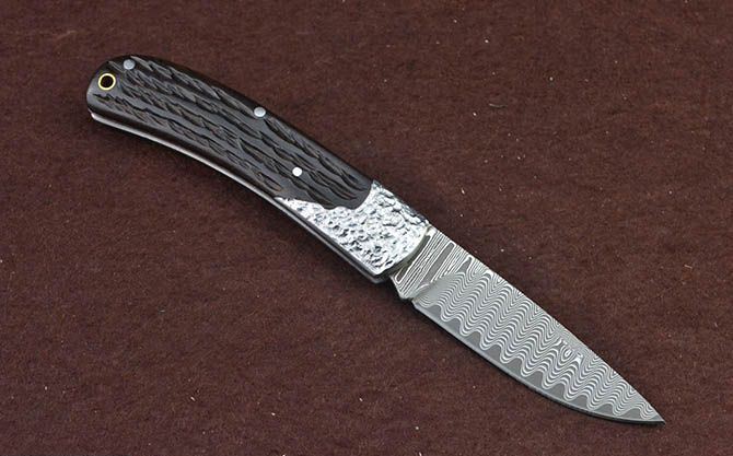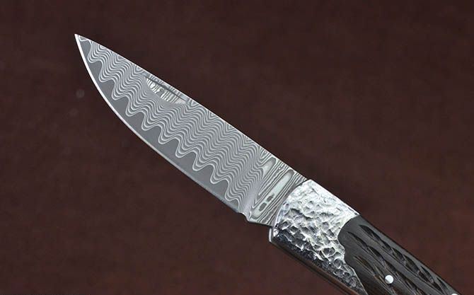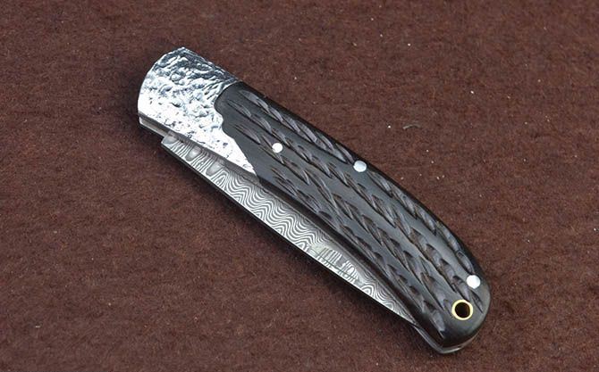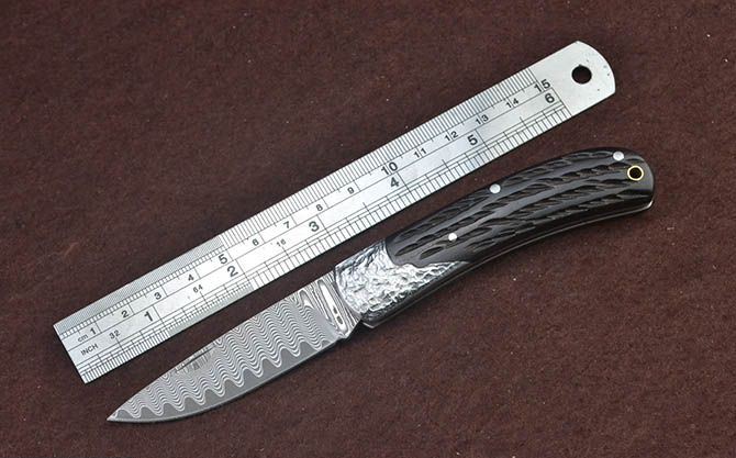 全 长:15.8cm 刃 长:6.5cm 刃 宽:1.8cm(最宽处) 柄 长:9cm 刃 厚:2.5mm 刃 材:大马士革 柄 材:压纹钢头+雕刻黑檀木 硬 度:59HRC 表 面:大马士革水波纹,手工研磨 重 量:87克(含包装) 锁 闭: 无 包 装:小布袋,纸盒子