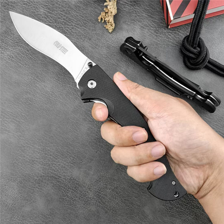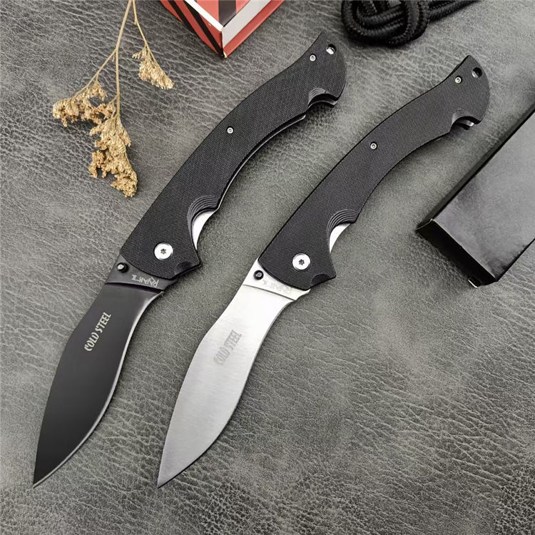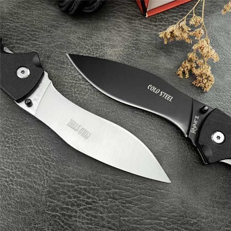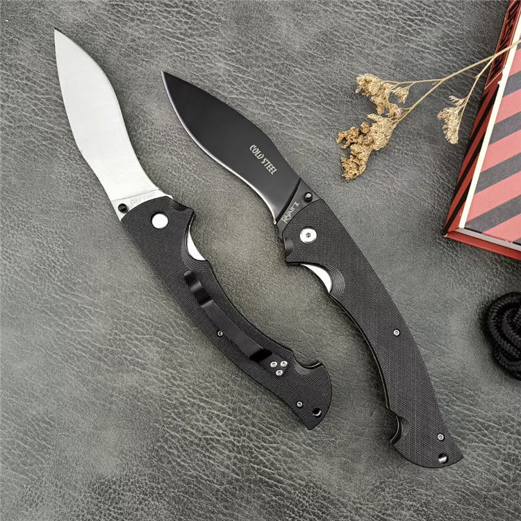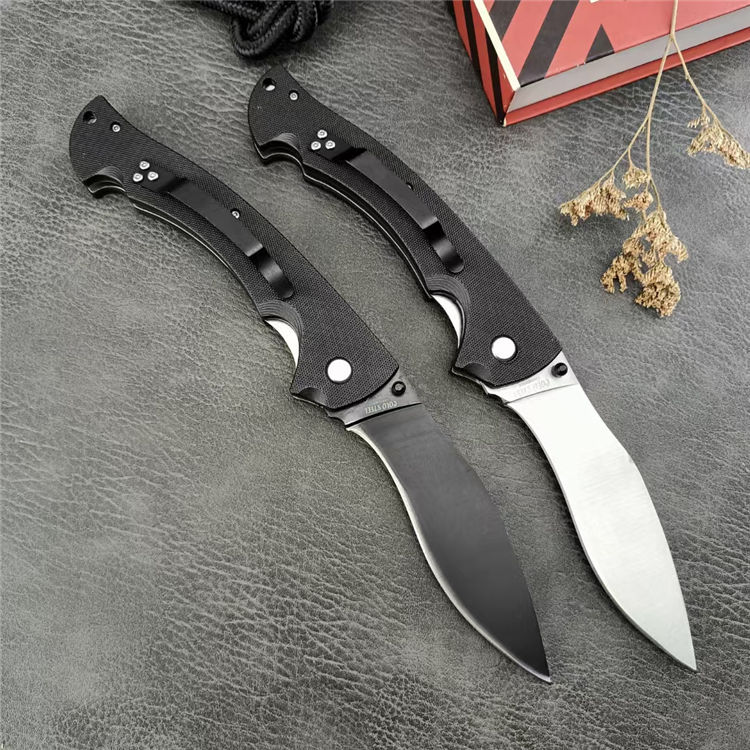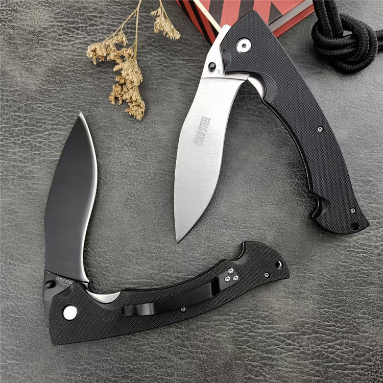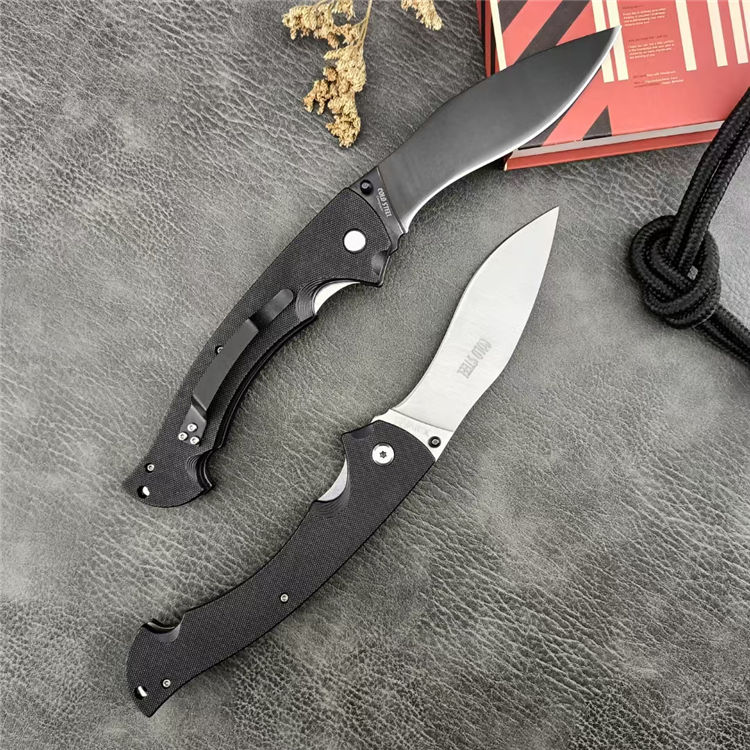 冷钢COLD新款大狗腿折刀 全长:27.5cm 刃长:12cm 柄长:15.cm 刃厚:0.36cm 刃宽:3.2cm 刃材:440C 柄材:尼龙纤维 硬度:56HRC 净重:250克 锁定:线锁 表面:精细沙光 其他:原厂彩合,送尼龙刀套