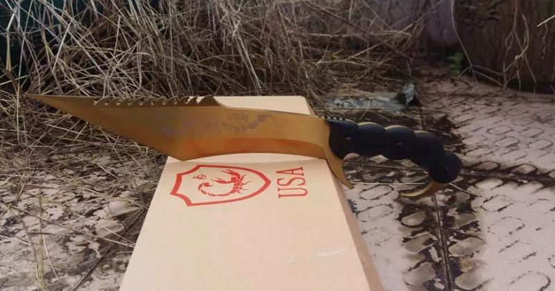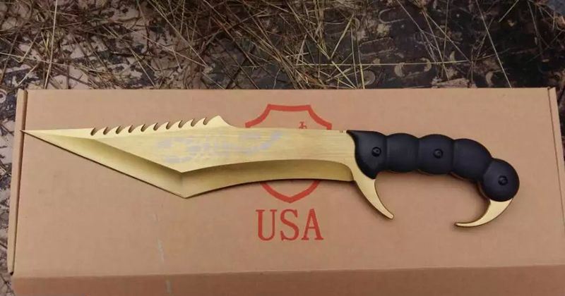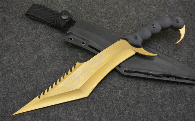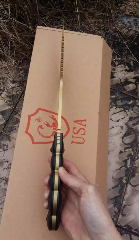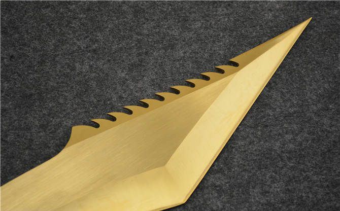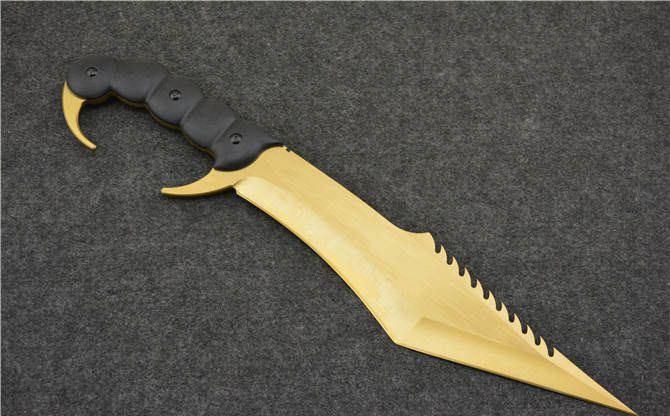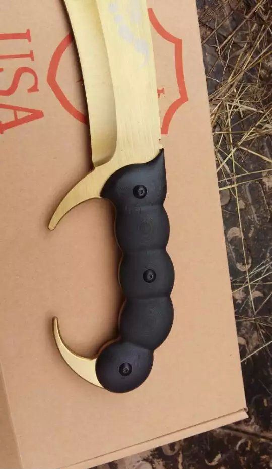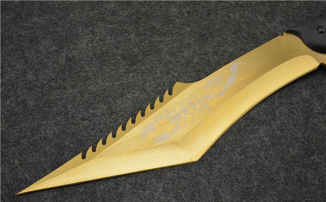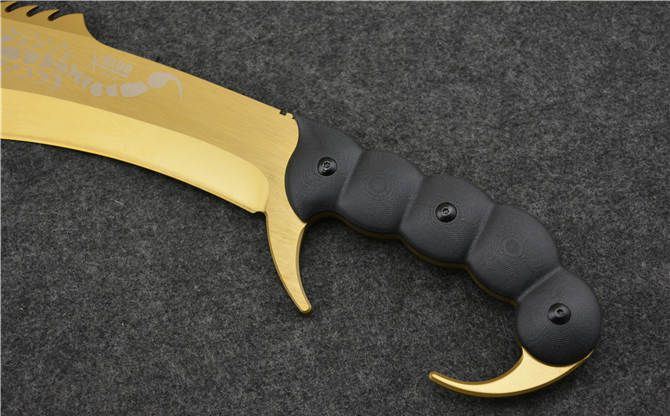土豪金神蝎直刀 全 长:43Cm 刃 长:29Cm 柄 长:14Cm 刃 宽:6.8Cm(最宽处) 刃 厚:6mm 刃 材:9CR18Mov 重 量:820克毛重 硬 度:59HRC 表 面:镀钛金 柄 材:G10柄 锁 型:定锁 其 他:配硬纸盒+K鞘