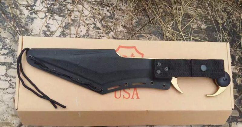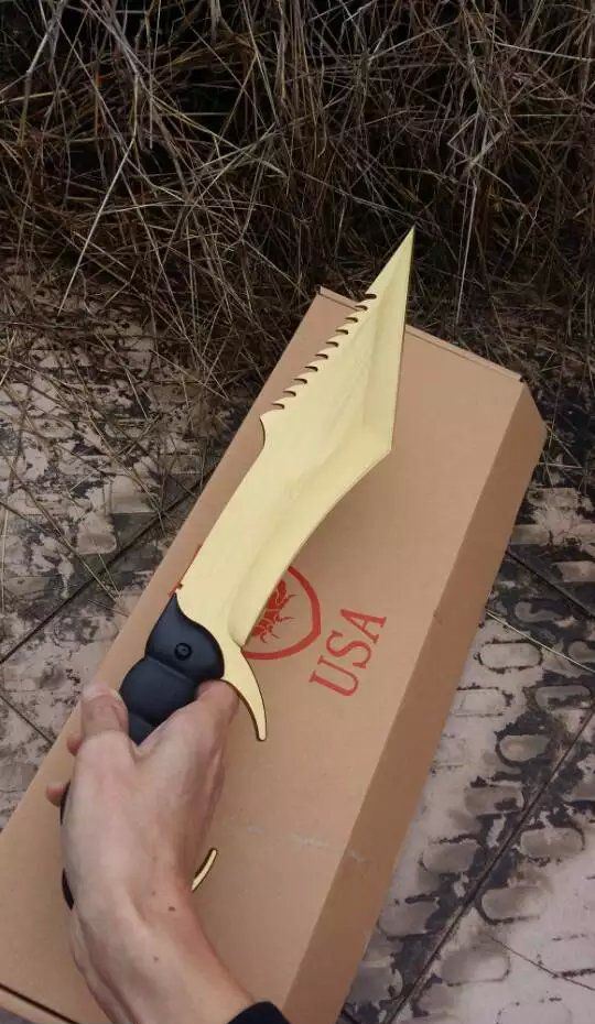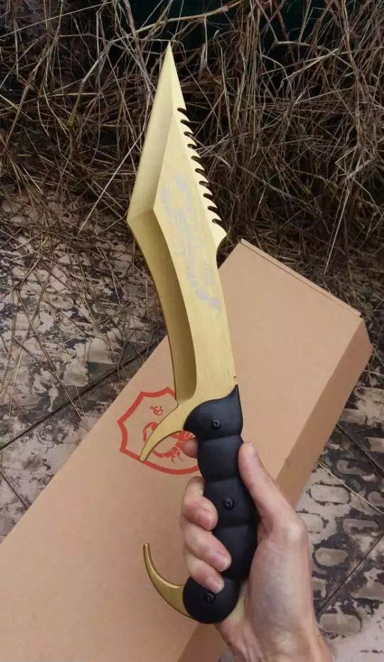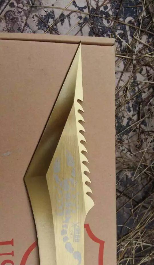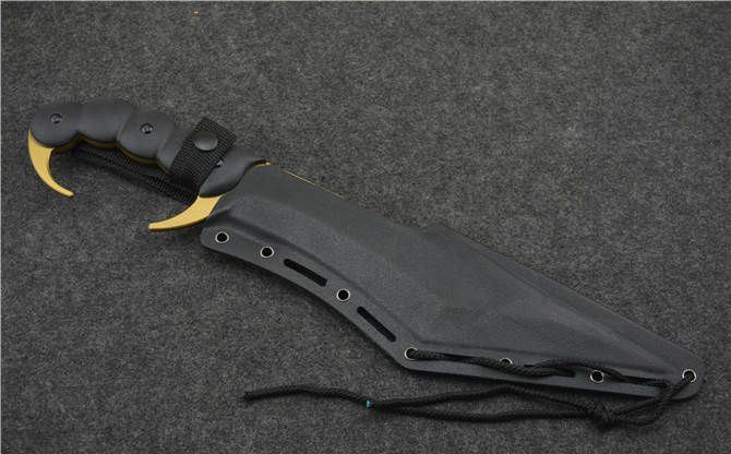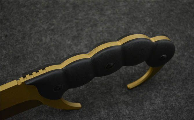 全 长:43Cm 刃 长:29Cm 柄 长:14Cm 刃 宽:6.8Cm(最宽处) 刃 厚:6mm 刃 材:9CR18Mov 重 量:820克毛重 硬 度:59HRC 表 面:镀钛金 柄 材:G10柄 锁 型:定锁 其 他:配硬纸盒+K鞘