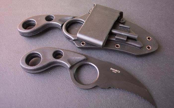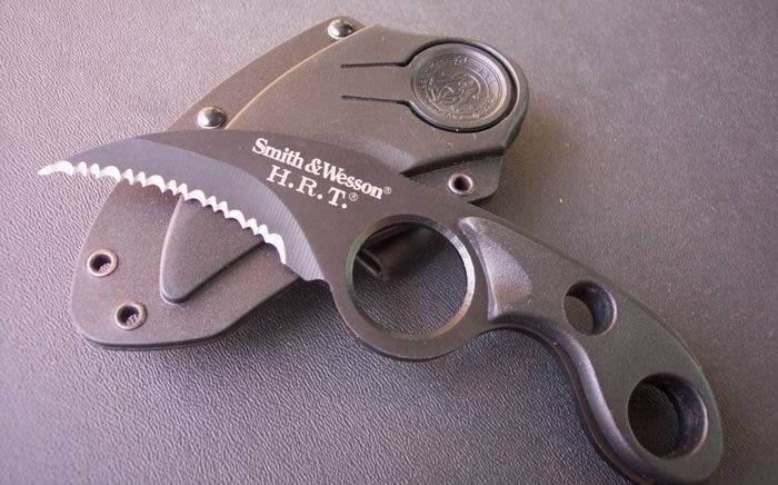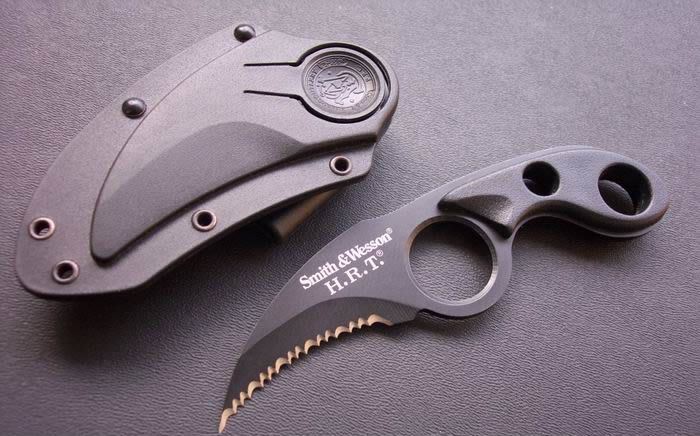 史密斯威森H.R.T.防卫爪(全齿) 全 长: 14.4cm 刃 长: 5.5cm 刃 宽: 3cm (最宽处) 刃 材: 440不锈钢 硬 度: 54 表 面: 电泳黑 刃 厚: 0.28cm 柄 长: 6.7cm 柄 材: 一体,外夹ABS塑料片 重 量:100克(含鞘) 其 他: ABS塑料战术刀鞘,带背夹. 锯齿刀刃