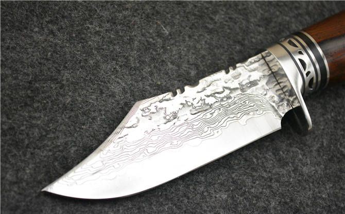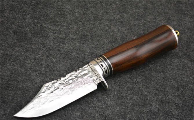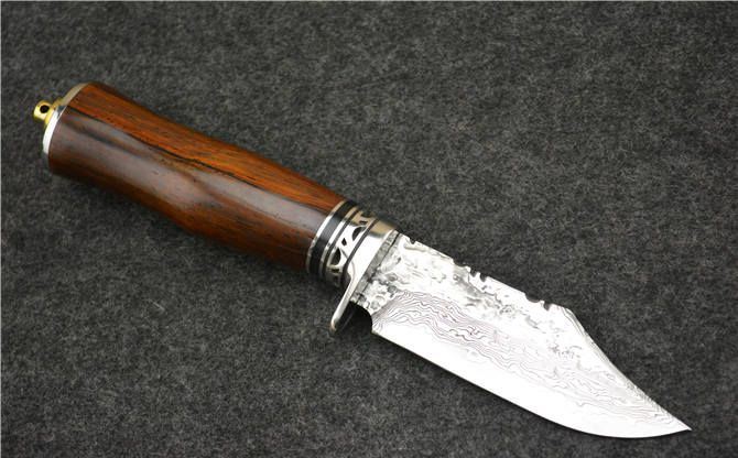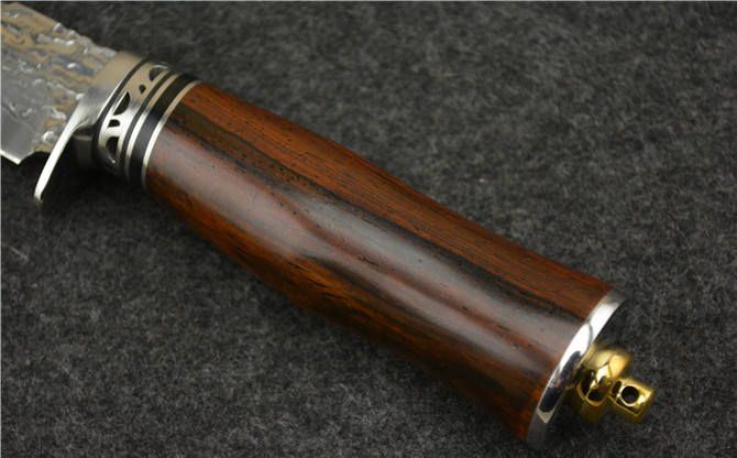 大马士革黄檀小霸王刀 全长:216MM 刃长:95MM 刃宽:28MM 刃厚:4.0MM 刀刃硬度:58~60HRC(VG-10芯层) 柄长:105MM 重量:238克 刃材:大马士革 柄材:黄檀+黄铜 包装:皮套+礼盒套装