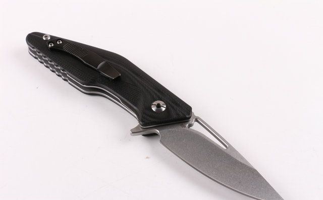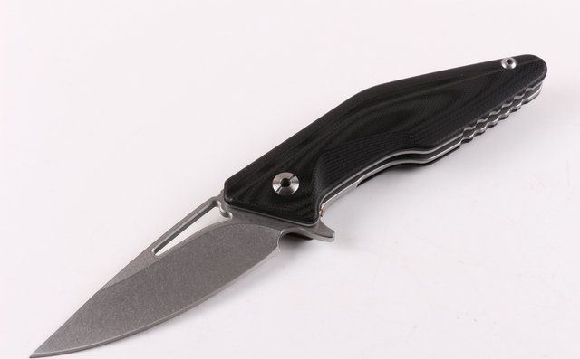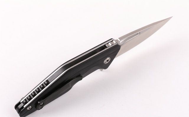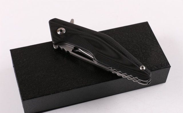 毒蝎D2钢折刀 全长:210mm 刃长:85mm 柄长:128mm 刃宽:31mm 刃厚:4.0mm 刃材:D2(深冷处理) 重量:250g(含包装) 硬度:58-60HRC 表面:石洗 柄材:手柄钢片+黑G10经CNC加工 刀夹:TC4钛合金背夹 螺丝:所有的螺丝420不锈钢硬度HRC45,全CNC精雕加工。 结构:分体组合锁杆式线锁结构,锁刀接触镶嵌合金粒,陶瓷定位珠,内置双排滚珠轴承 其他:礼品盒