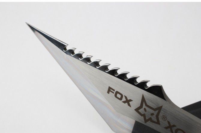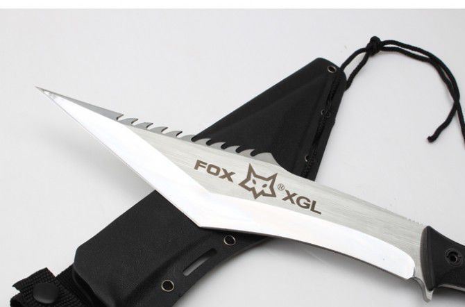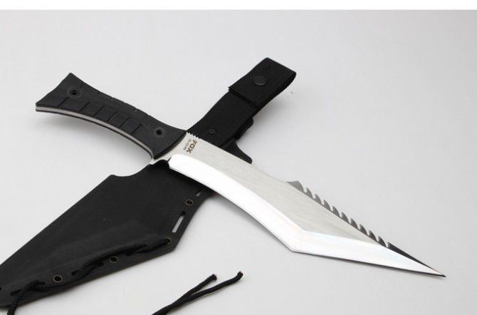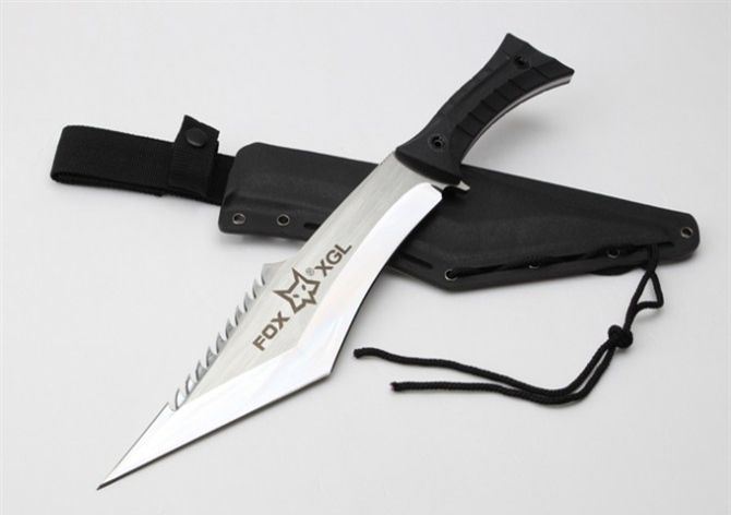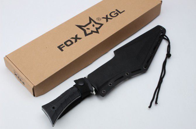 FOX狐狸牙刀 全 长:43cm 刃 长:29cm 柄 长:14cm 刃 宽:6.8cm(最宽处) 刃 厚:6mm 刃 材:9CR18Mov 重 量:820克毛重 硬 度:59HRC 表 面:镜光拉丝 柄 材:G10柄 锁 型:定锁 其 他:配硬纸盒+K鞘