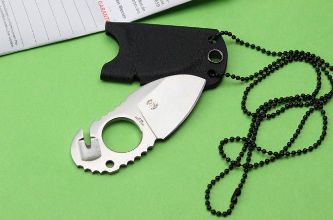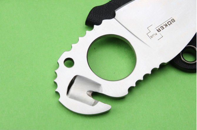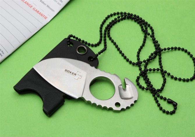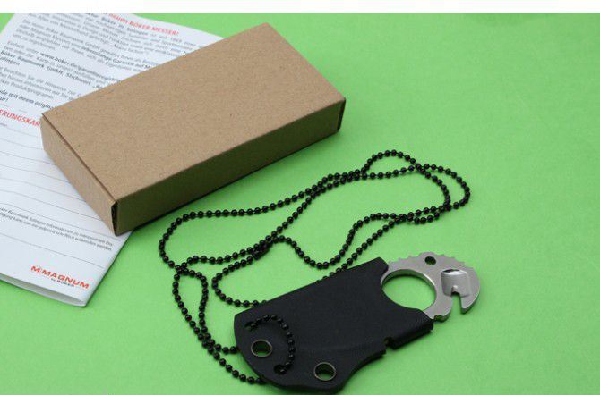 博克指环颈刀 全长:8.5cm 刃长:4.3cm 刃厚:3mm 刃材:440C 硬度:58HRC 刀重:100g 表面:拉丝 柄材:全钢 刀鞘:进口K鞘 整把刀线切割,CNC加工型成,质量,手工非常完美。配说明书