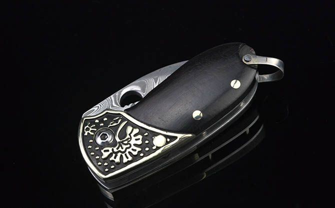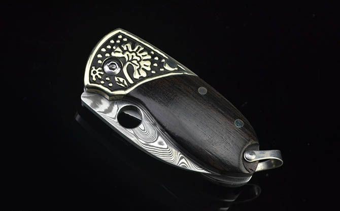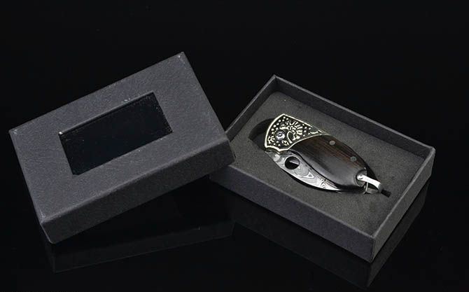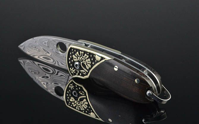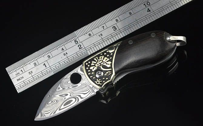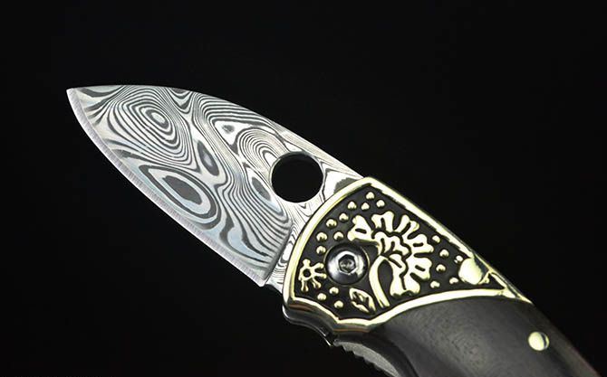 大马士革瑞典粉末小玛苏折刀 全 长:10cm 刃 长:4.1cm 刃 宽:2cm(最宽处) 柄 长:6cm 刃 厚:2.8mm 刃 材:大马士革瑞典粉末钢 柄 材:雕花铜头+黑檀木柄片 硬 度:59HRC 表 面:大马士革瑞典粉末钢花纹 重 量:80克(含包装) 锁 闭: 线锁 包 装:高档纸盒