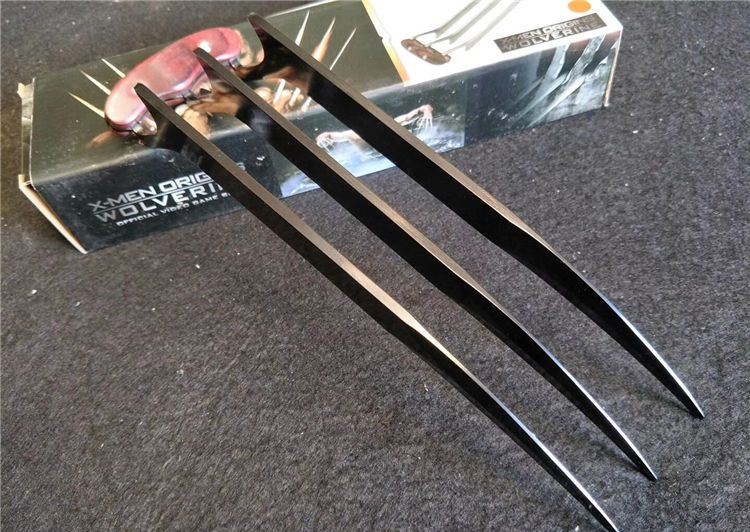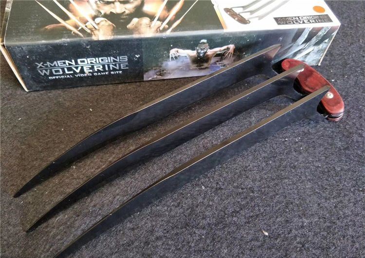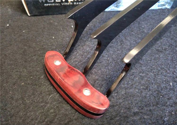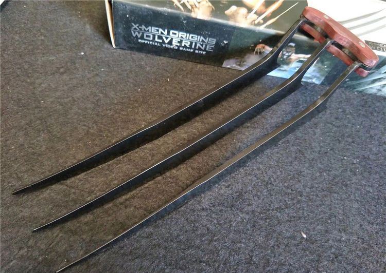 金刚狼(电影版) 全长:27.0cm 刃长:24.0cm(三头一样长度) 刃宽:2.1cm 刃厚:0.45cm 刃材:420不锈钢 硬度:55HRC 表面:砂光 柄材:全钢+两面黑木 柄长:1.7cm 柄宽:7.0cm 重量:420克