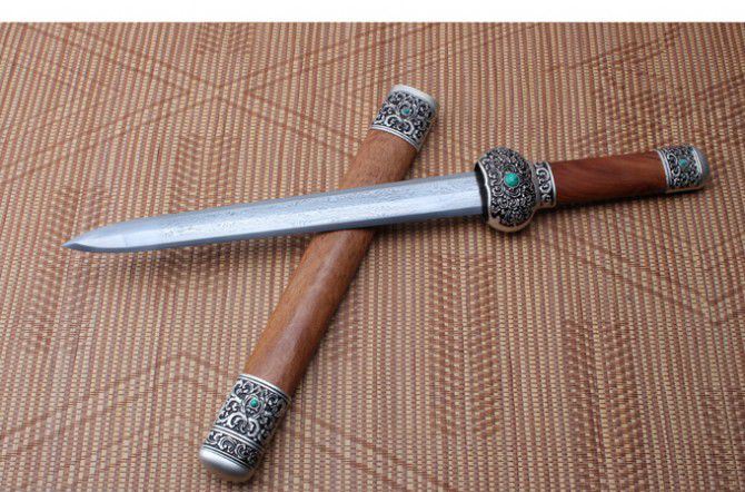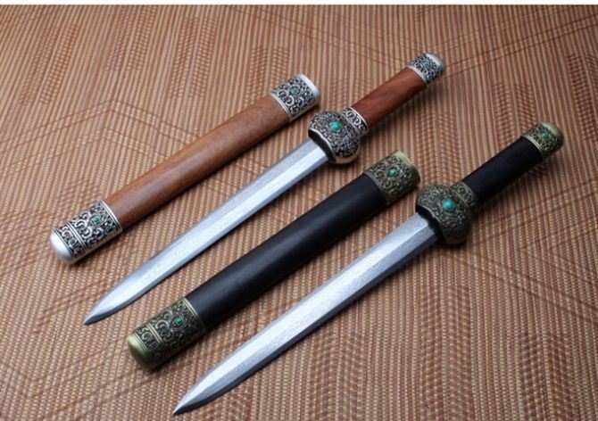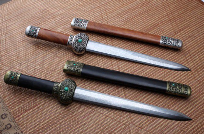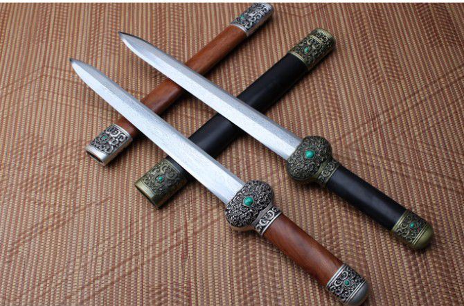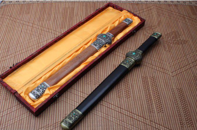 11寸金兰剑(黑檀木、花梨木) 【规格】 全长:50.3cm左右,刃长:29.5cm,柄长:18.0cm,刃宽:3.3cm,刃厚:0.9cm 【刃材】 花纹钢手工打造 【工艺】 花纹钢手工打造 古法热处理 手工精细磨 【鞘材】 名贵檀木 【装具】 铜装 【硬度】 57 HRC 【柄材】 名贵檀木 【赠品】 锦盒 【其他】 手工产品,稍有差别,请以实物为准